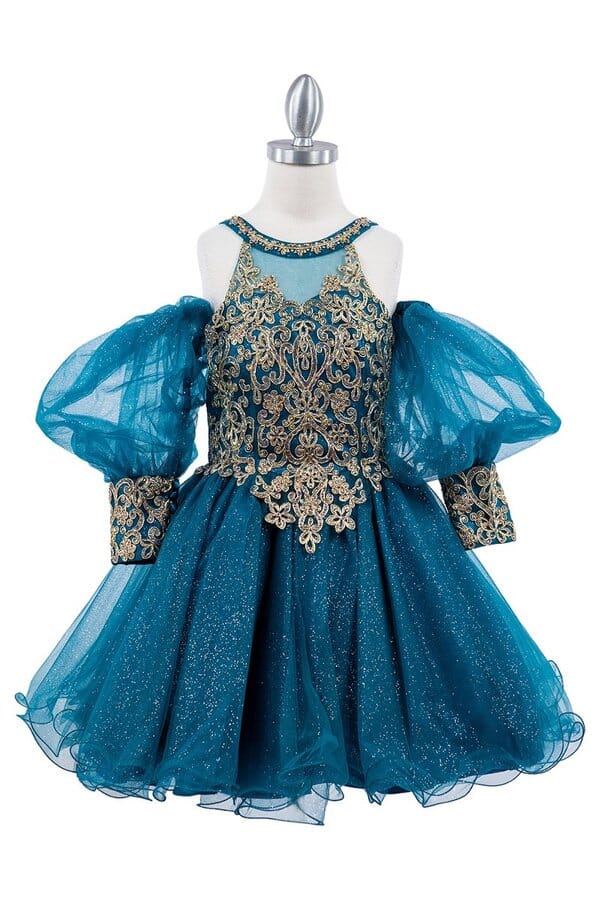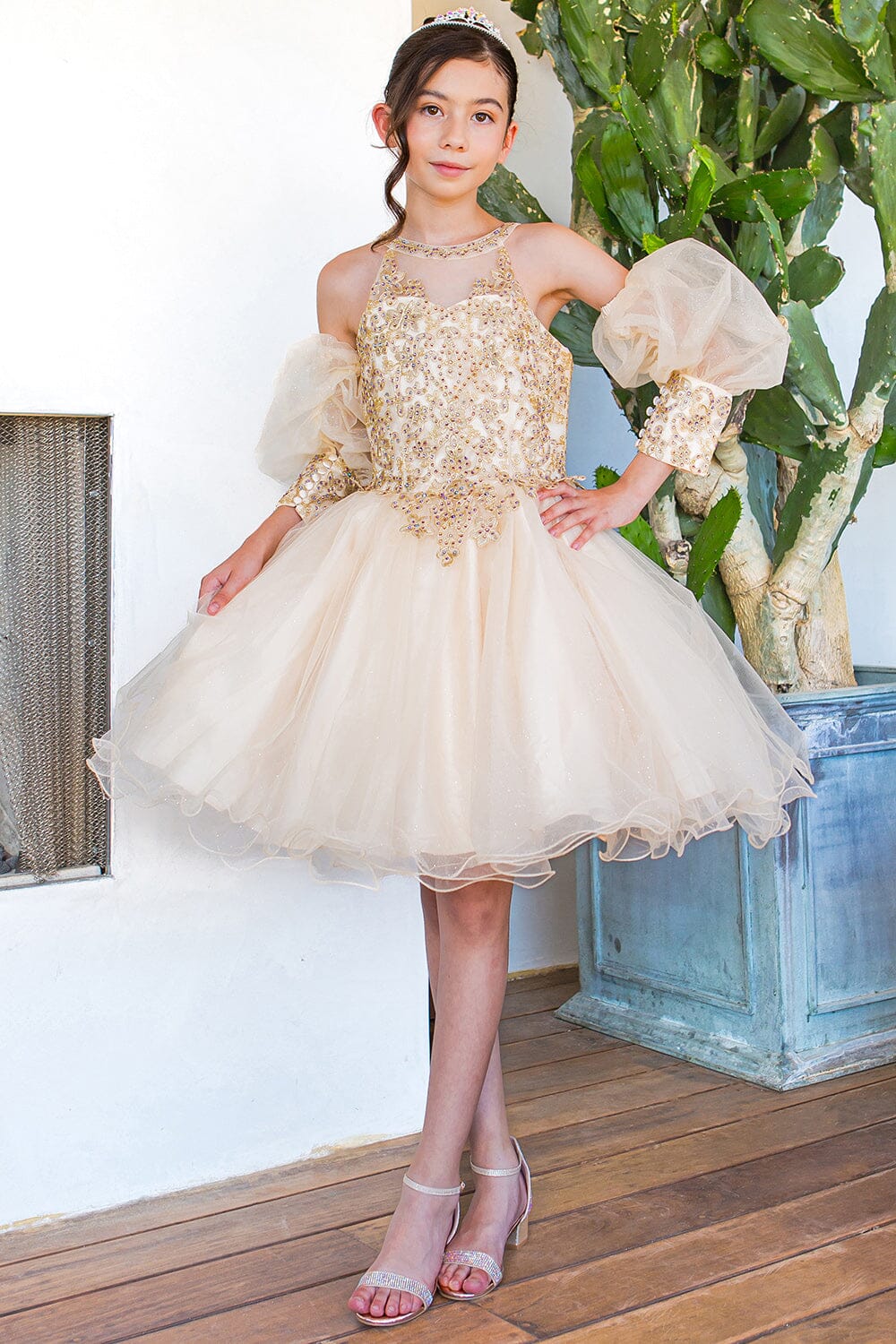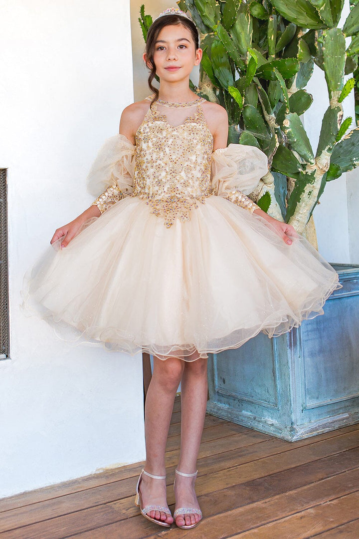 Your sweet girl will captivate the room in this lace applique short puff sleeve dress with A-line ruffled skirt by Cinderella Couture 5113. This short party dress features an illusion halter bodice, detachable puff sleeves, an open lace-up corset back, and a short A-line skirt with a curly hemline.