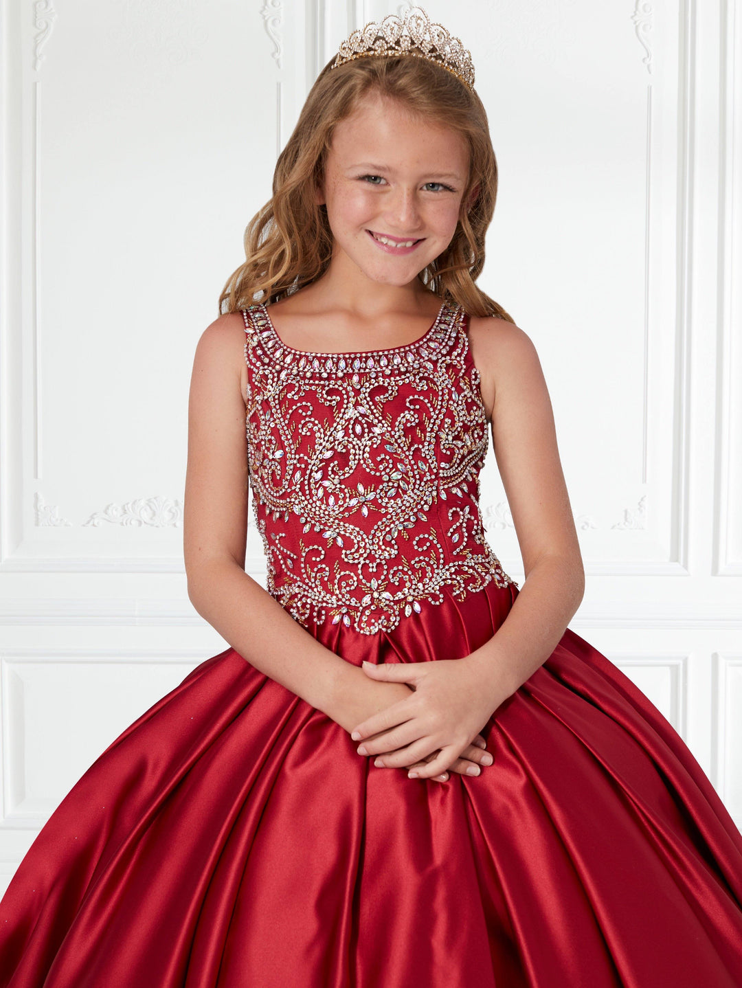 Your sweet girl will receive lots of compliments in this beaded long sleeveless dress with box pleated A-line skirt by Tiffany Princess 13591. Made out of satin, this beautiful ball gown features a scoop neck bodice adorned with sparkly beads, side pockets, partial open back, a floor length A-line pleated skirt, sweep train, and a lace-up corset back.