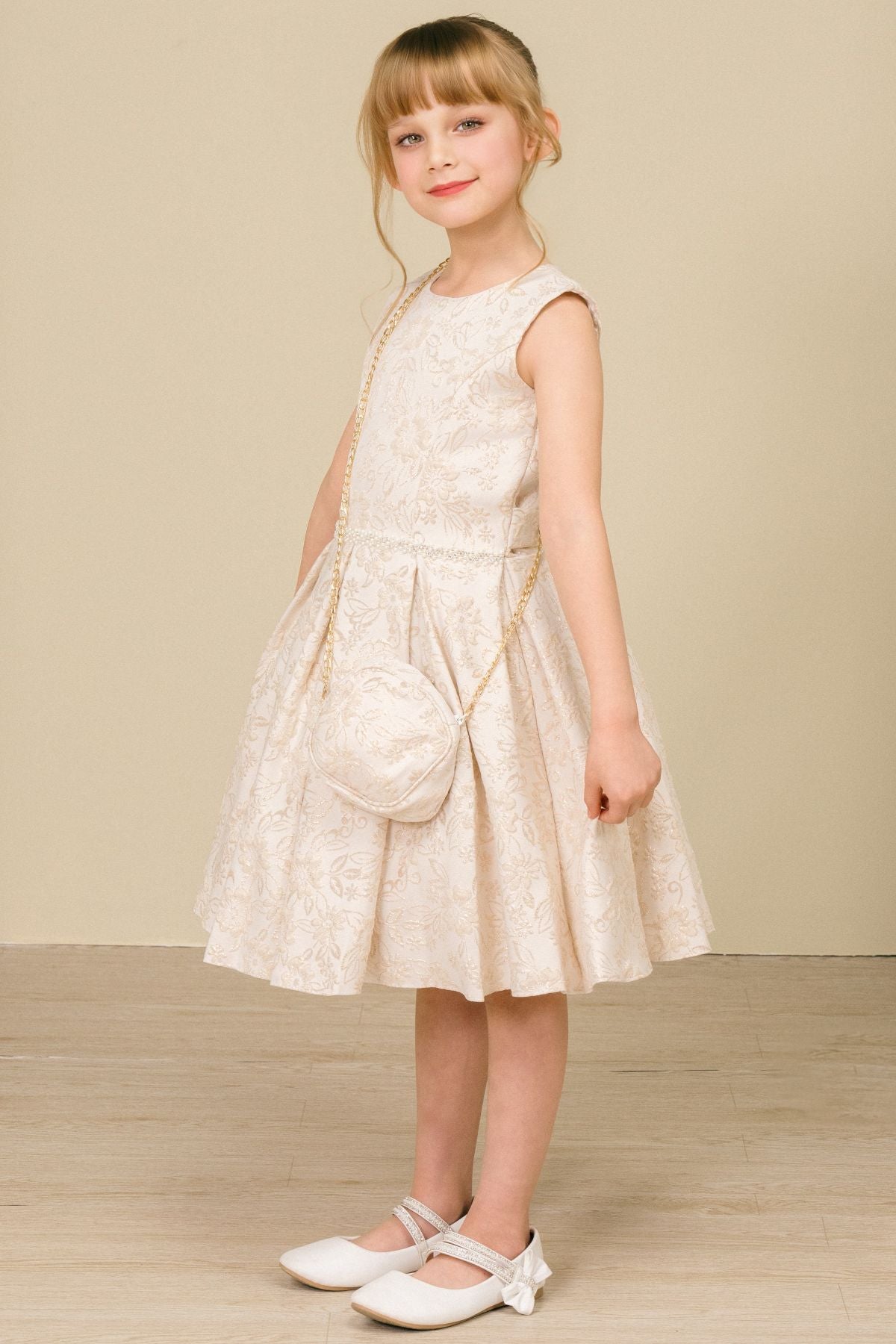 Your sweet girl will look picture-perfect in this jacquard print short sleeveless dress with A-line skirt by Cinderella Couture 9164. Elegant foil print jacquard dress with jewel neck. Imperial pleated skirt with rhinestone waist. A shoulder bag is included.