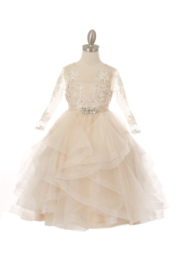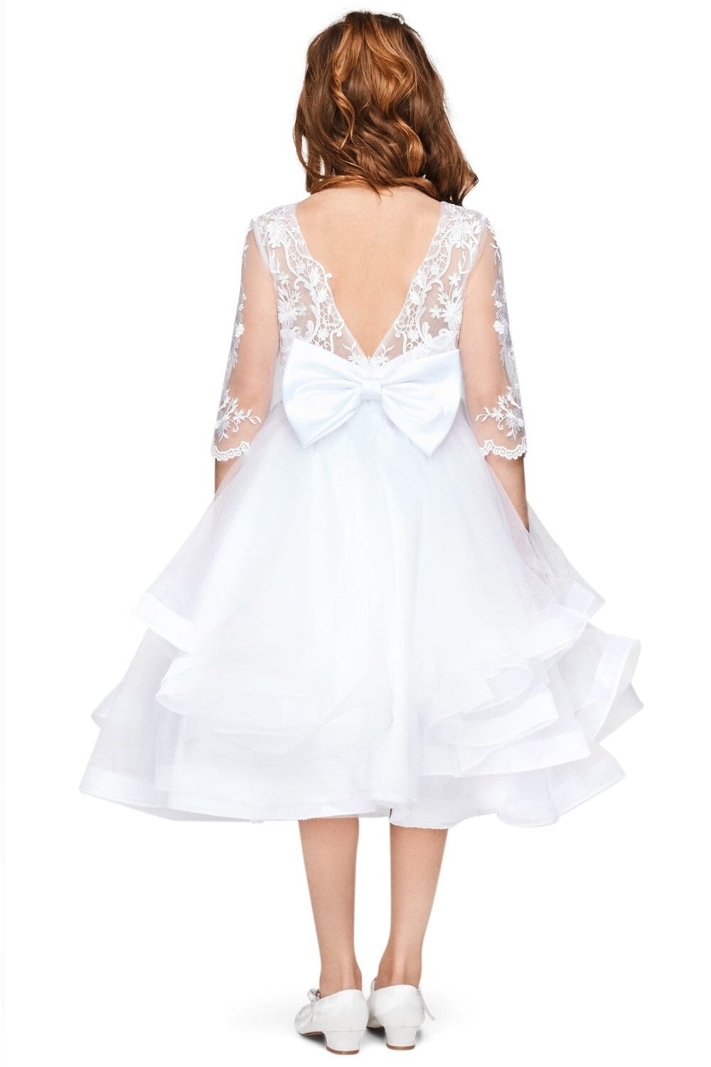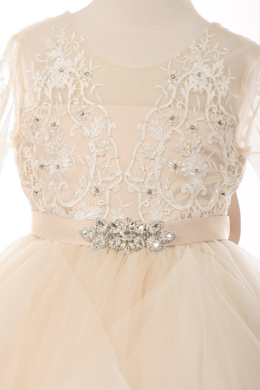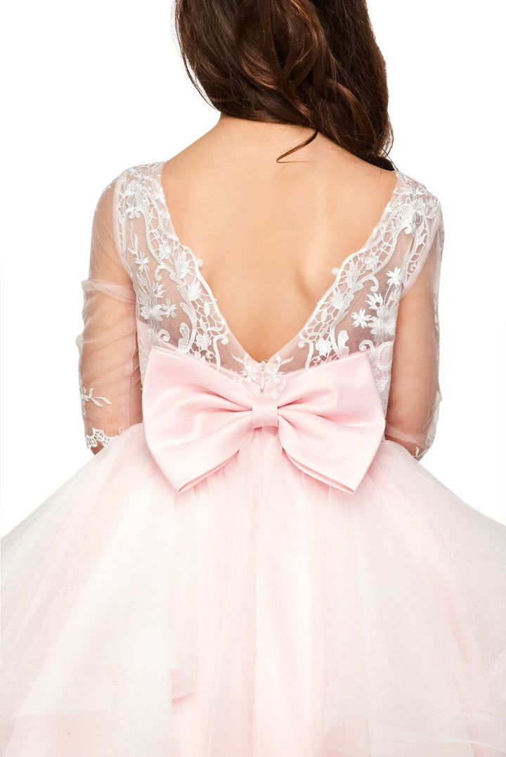 Your sweet girl will look timeless in this short lace bodice 3/4 sleeve dress with A-line layered skirt by Cinderella Couture 5075. Elegant classy pearls and rhinestones beaded in beautiful 3/4 sleeve lace, rhinestone brooch accent attached on waist satin ribbon, beautiful back V shape back with a detachable bow with snap buttons.