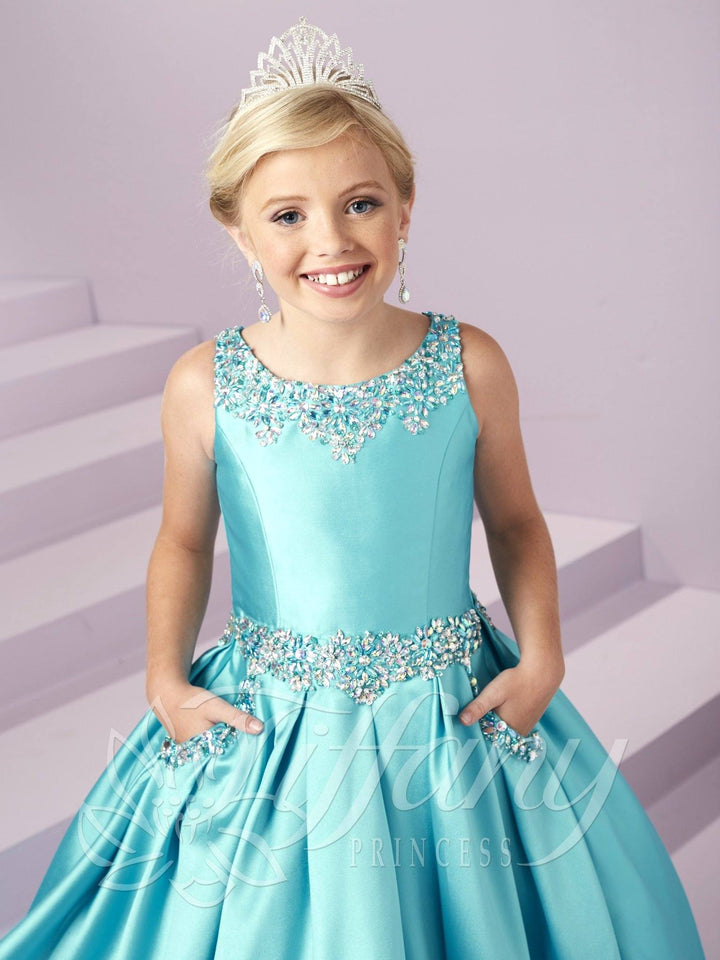 Your sweet girl will love twirling around in this beaded long sleeveless dress with A-line skirt by Tiffany Princess 13485. A beaded scoop neckline and waistband showcase this adorable ball gown. Complete with a box pleated, A-line mikado skirt with front pockets, and an open back with lace-up.