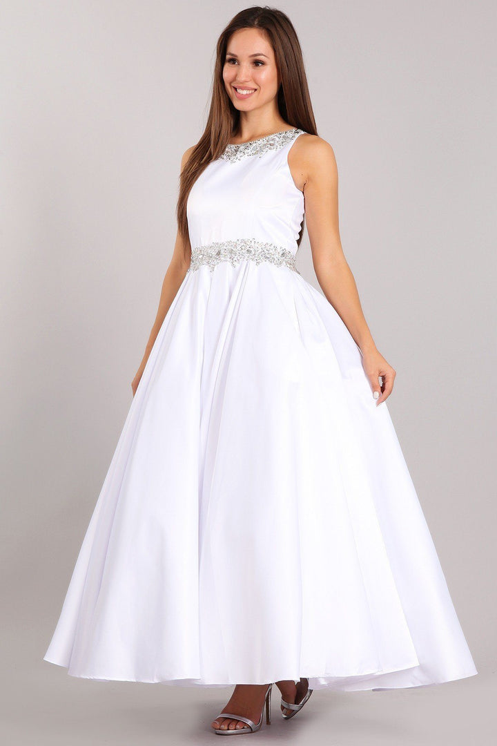 Your little girl will be the Belle of the party in this ball gown! Your precious girl will look lovely in this beaded sleeveless satin dress. This sleeveless floor length gown features a high scoop neckline bodice with shimmering beading adorning the top as well as the waistline, cut out open back, two convenient side pockets, a classic full length pleated A-line skirt, and a lace-up corset back.