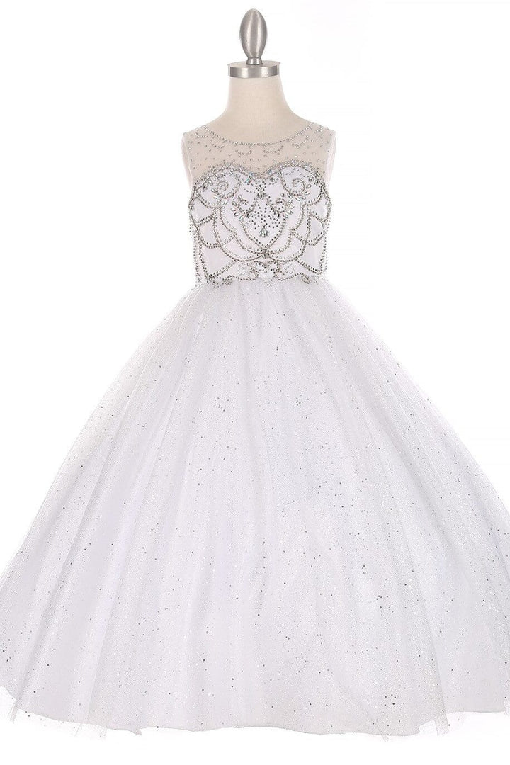 Your little girl will be the center of attention in this ball gown! Your precious girl will look lovely in this sparkly hand beaded rhinestone illusion dress. This sleeveless floor length gown features a beautiful sleeveless round illusion neckline bodice that is adorned with AB tone crystal beading, a fully gathered A-line skirt drops in full to the floor length in layers of glitter tulle fabric, and an adjustable lace-up corset back with an invisible zipper.
