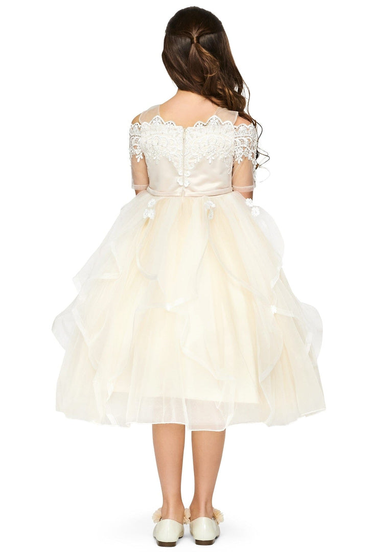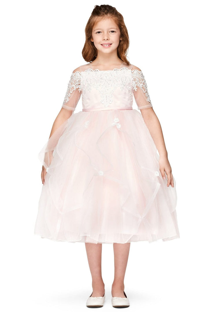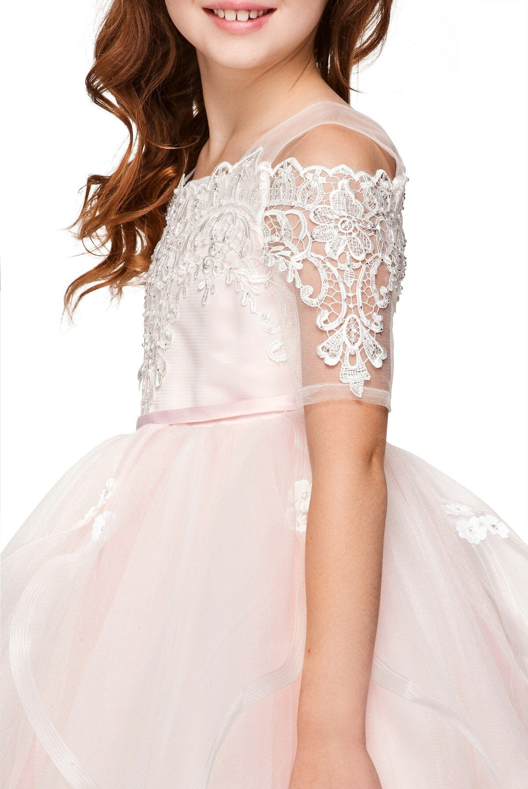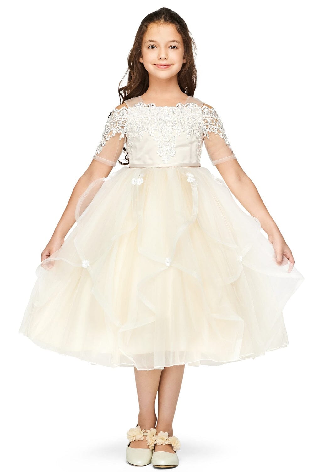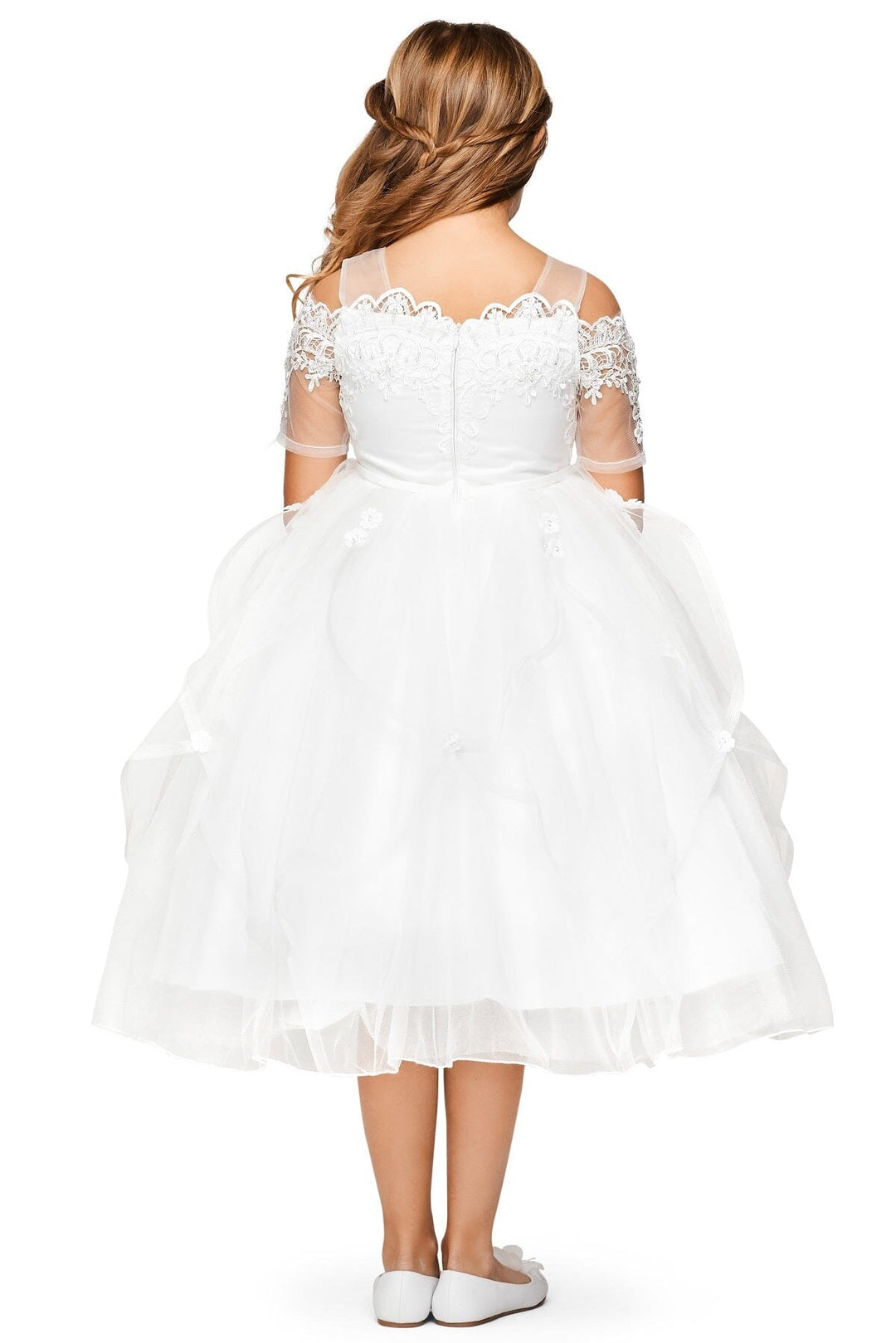 Your sweet girl will look timeless in this lace applique off the shoulder tea length dress with A-line layered skirt by Cinderella Couture 5091. Elegant off shoulder girl's gown with rhinestones and pearled lace dress with sleeves; small flowers on the skirts have rhinestones.