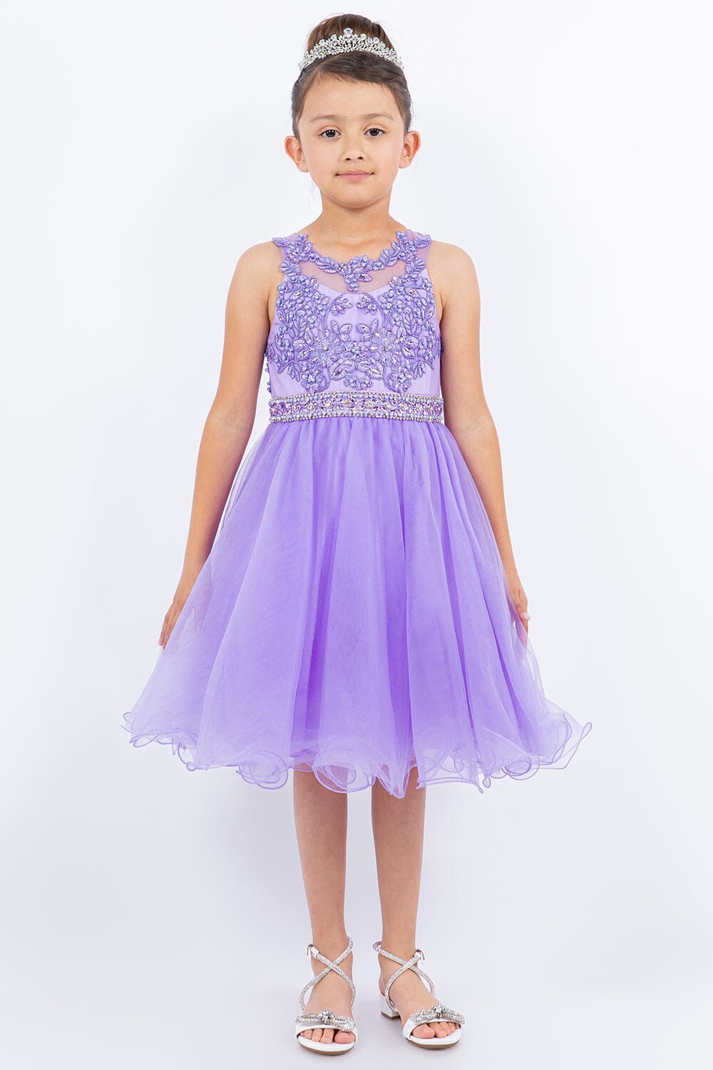 Your sweet girl will be selfie ready in this short ruffled tulle dress with beaded lace applique bodice by Cinderella Couture 5013. This beautiful jewel tulle sleeveless dress features a sheer lace bodice accented with rhinestone pearl beads, matching rhinestone and pearl belt on the waistline, tulle wired skirt with a curly hemline, illusion back, and a zipper closure.