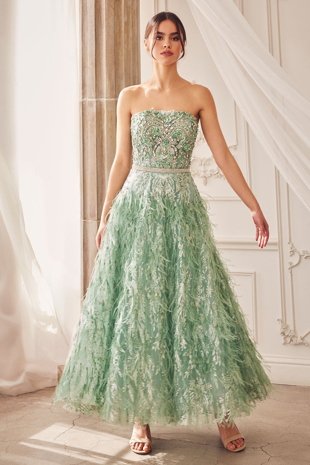 Feather Fitted Strapless Gown by Jessica Angel 569