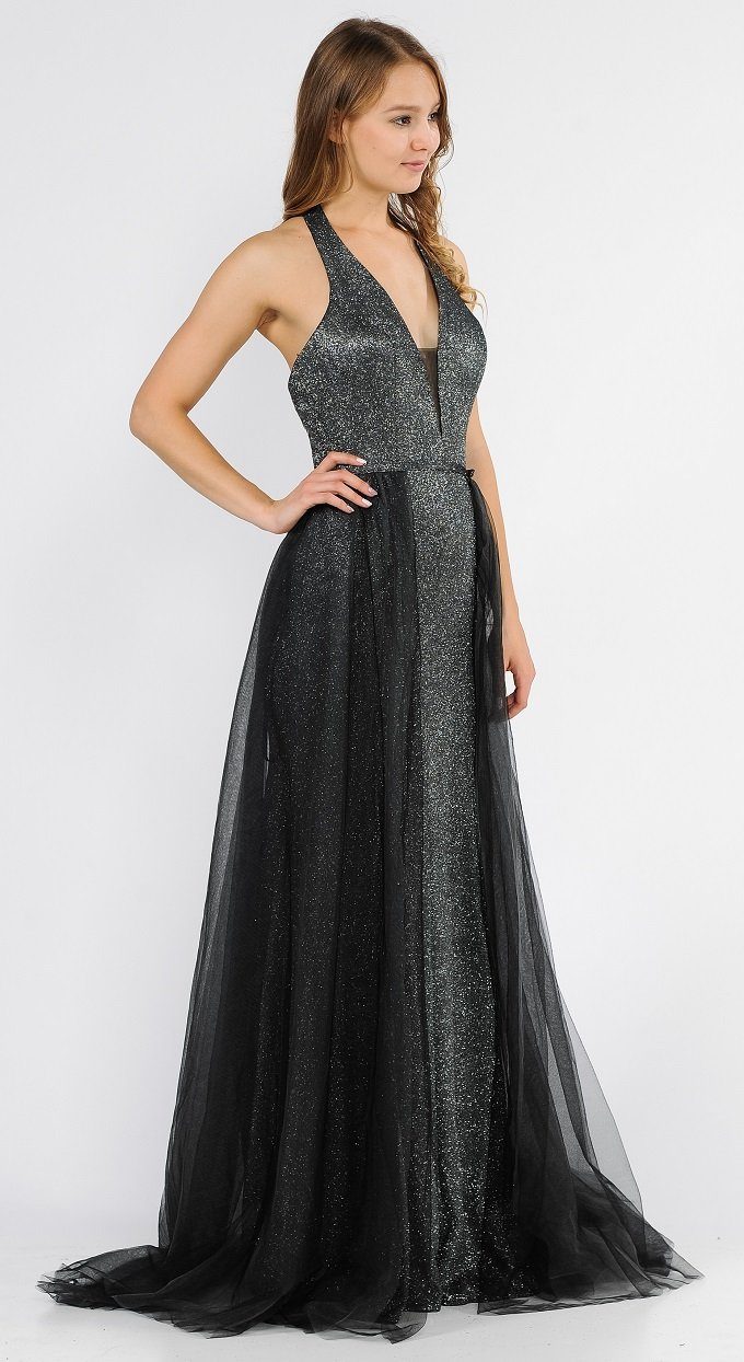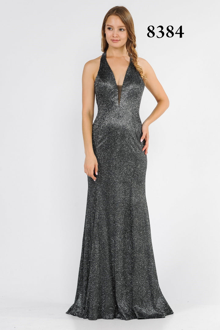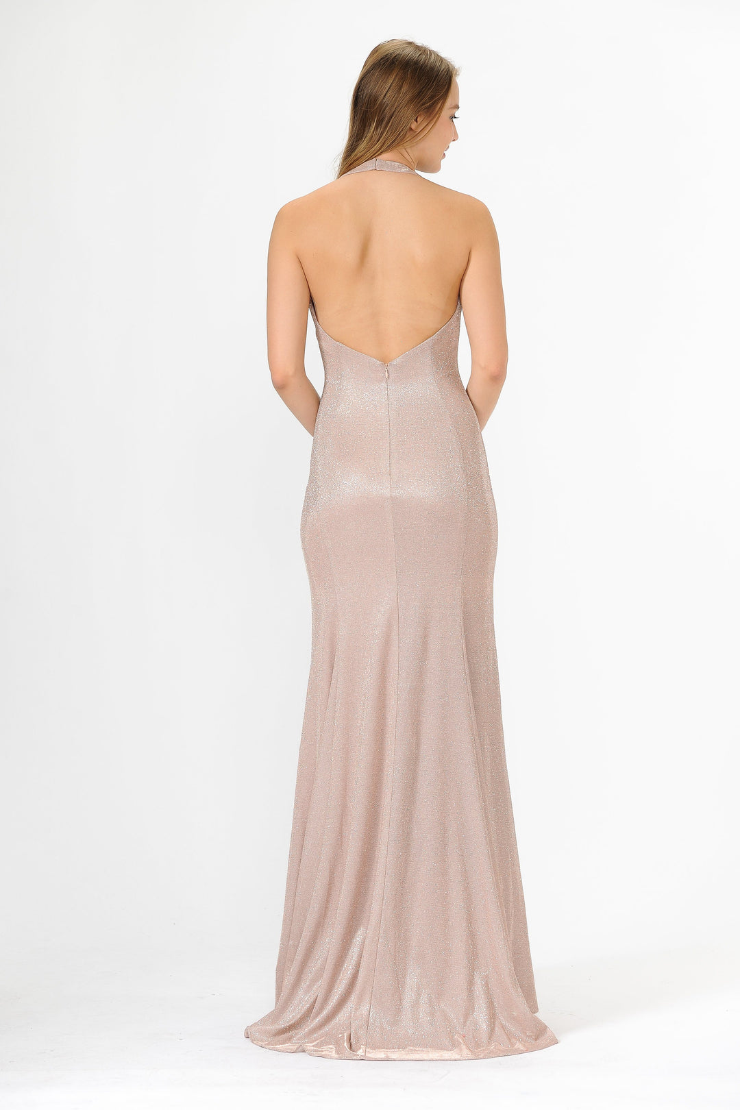 Be the center of attention in this long glitter halter dress with open back by Poly USA 8384. This beautiful formal gown features a V-neck bodice secured with a sheer inset panel, flirty open back, floor length A-line skirt, and a zipper closure. Affordably priced under $200, this long evening dress is perfect for any formal event and will keep you on budget!