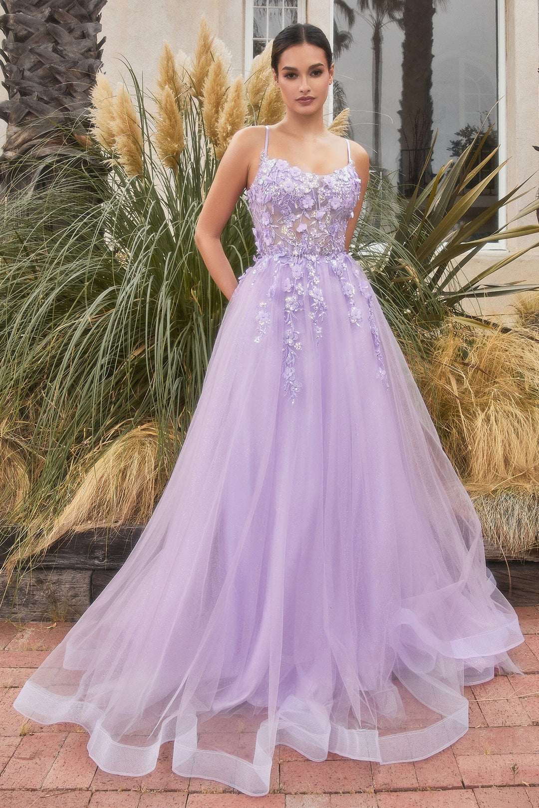 Dance the night away in this 3D floral applique long sleeveless dress with A-line skirt by Andrea & Leo A1142.