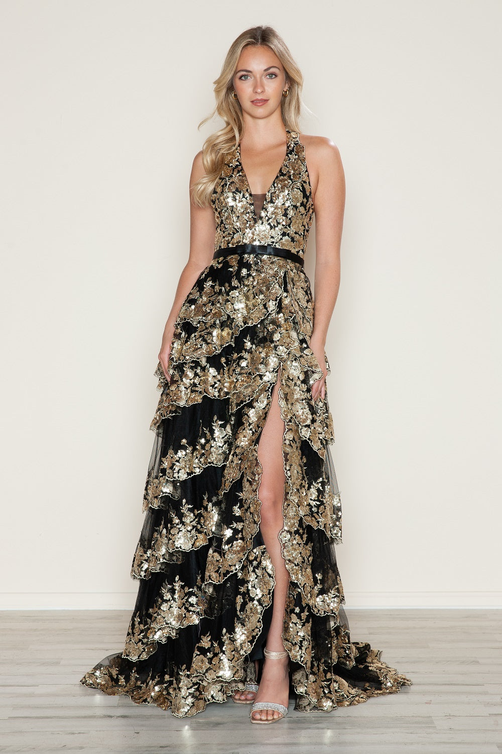 Turn heads in this sequin applique long halter dress with an A-line tiered slit skirt by Poly USA 9618.