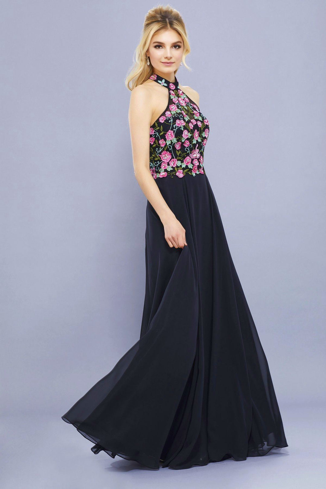 Look feminine and chic in a long halter dress with floral embroidered bodice by Nox Anabel 8326. This long evening gown features a high-neck halter bodice adorned with beautiful floral embroidery, sheer illusion neckline, flirty open back, full length skirt that elegantly flows to the floor, and a zipper closure. Affordably priced under $200, this dress is perfect for any formal event and will keep you on budget!