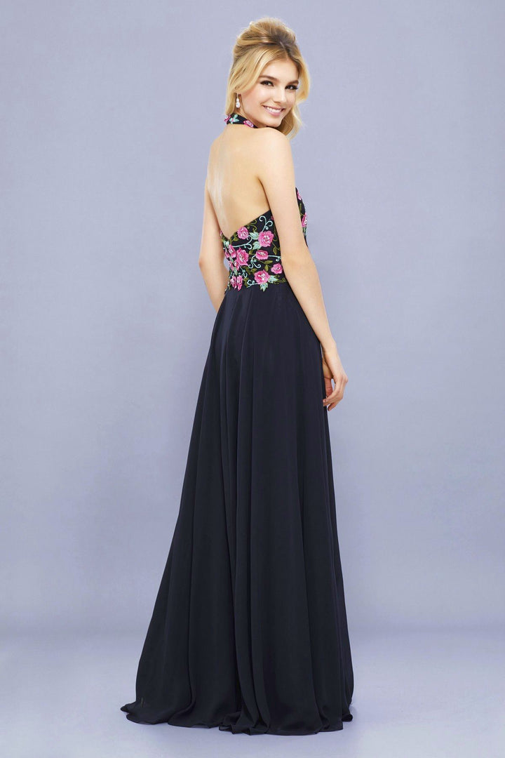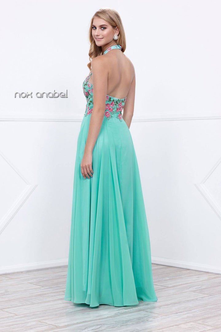 Long Halter Dress with Floral Embroidery by Nox Anabel 8326-Long Formal Dresses-ABC Fashion