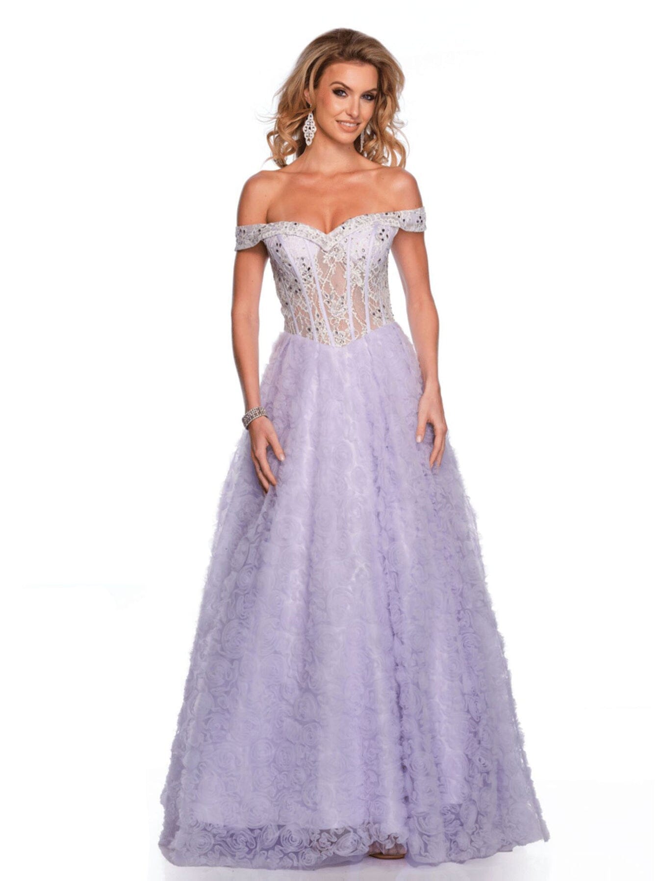 Look like a fairy-tale Princess in this lace bodice long off the shoulder tulle dress with an A-line ruffled skirt by Dave & Johnny 11610.