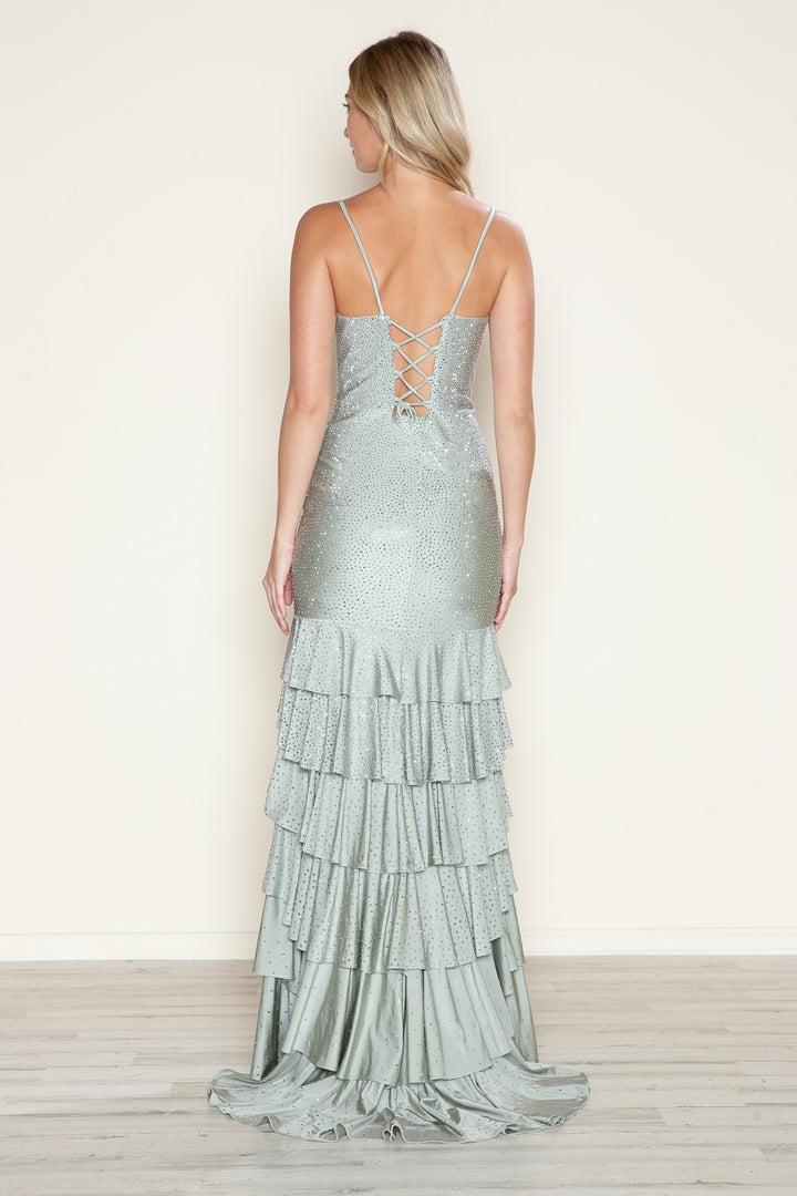 - Beaded V-Neck Tiered Slit Gown by Poly USA 9620