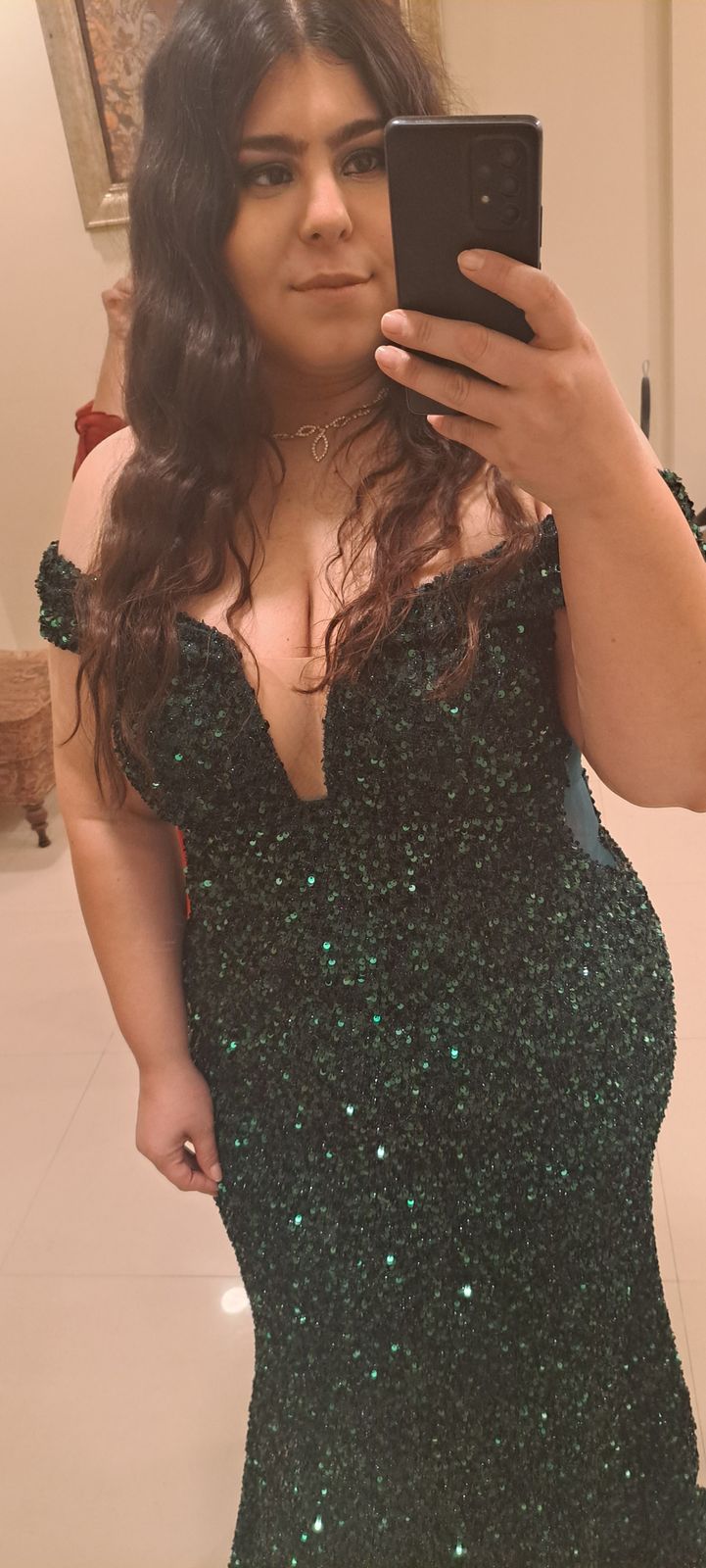 Dazzle the room in this fitted off the shoulder sequin gown by Cinderella Divine CD975. Off the shoulder sequin decadence. This gorgeous twinkling gown has thin optional straps and u-neckline. Mermaid fit and horsehair hemline for rippling structure.