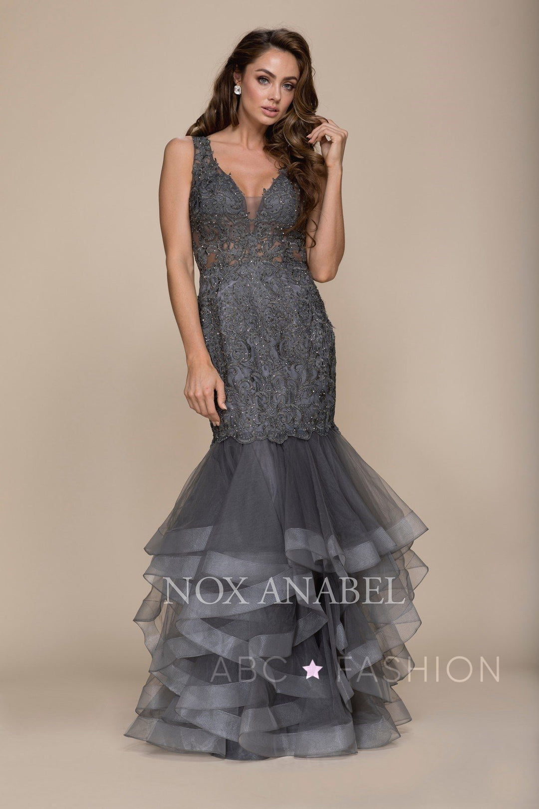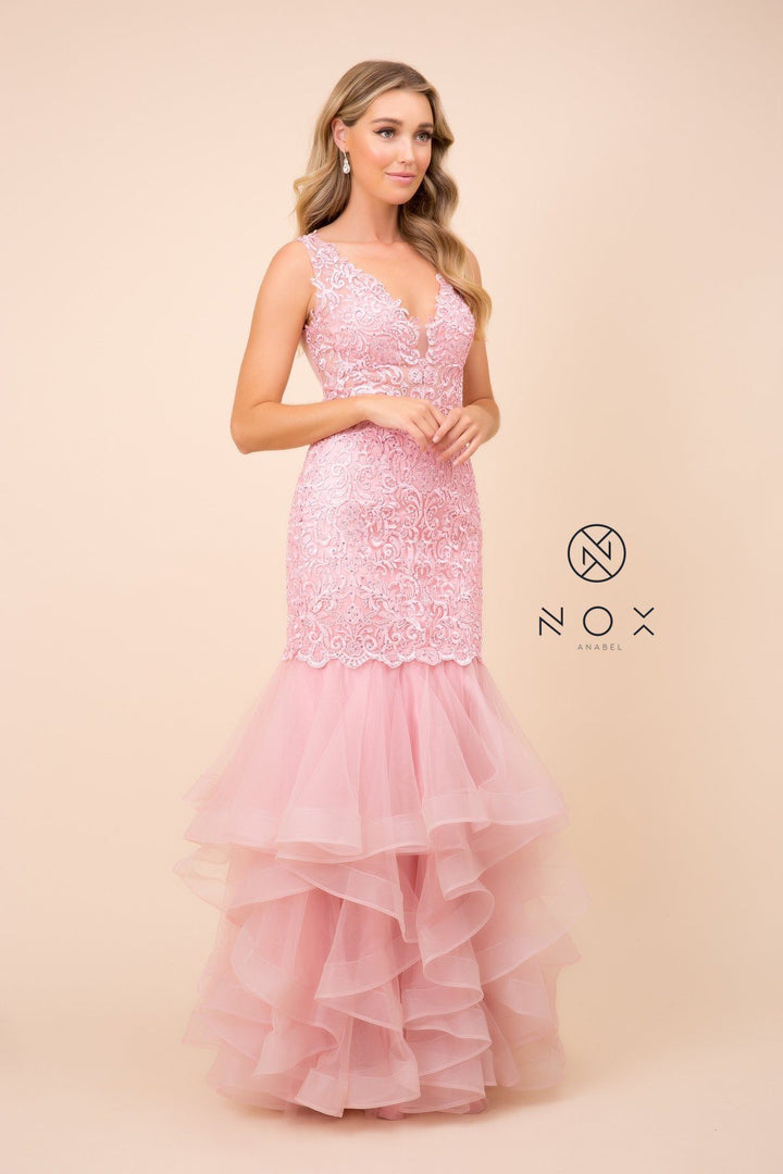 Look red carpet ready in this beaded lace ruffled mermaid gown by Nox Anabel A059. This evening dress features a deep V-neckline secured with a sheer inset panel, beautiful beaded lace bodice, embellished sheer back, full length mermaid tulle skirt with a ruffled hemline, and a zipper closure. Perfect for any formal event!
