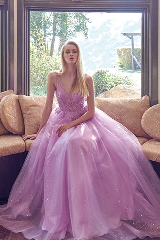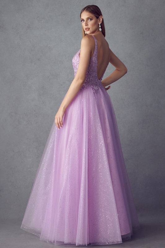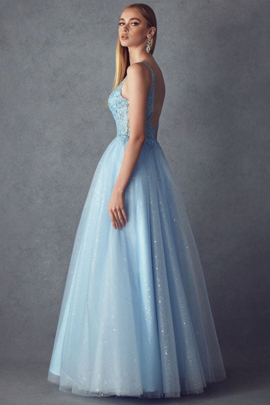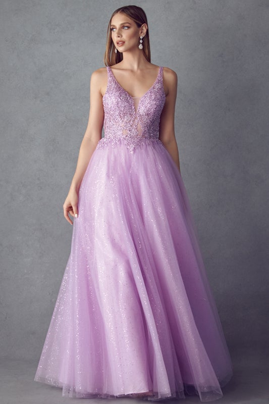 Look mesmerizing in this long sleeveless embroidered tulle dress with A-line skirt by Juliet 257. The illusion v-neck with embroidered bodice and open back with glitter tulle skirt will have all eyes on you!
