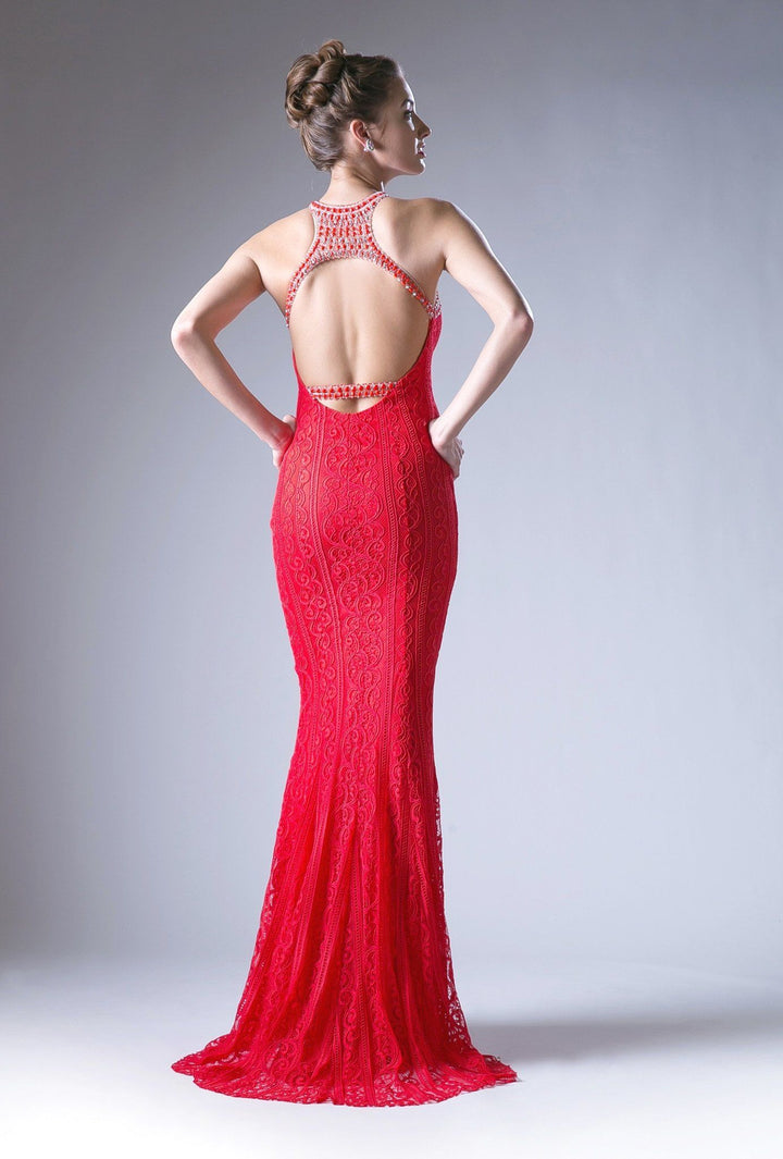 Turn heads in this red halter lace dress with beaded top by Cinderella Divine 13729.