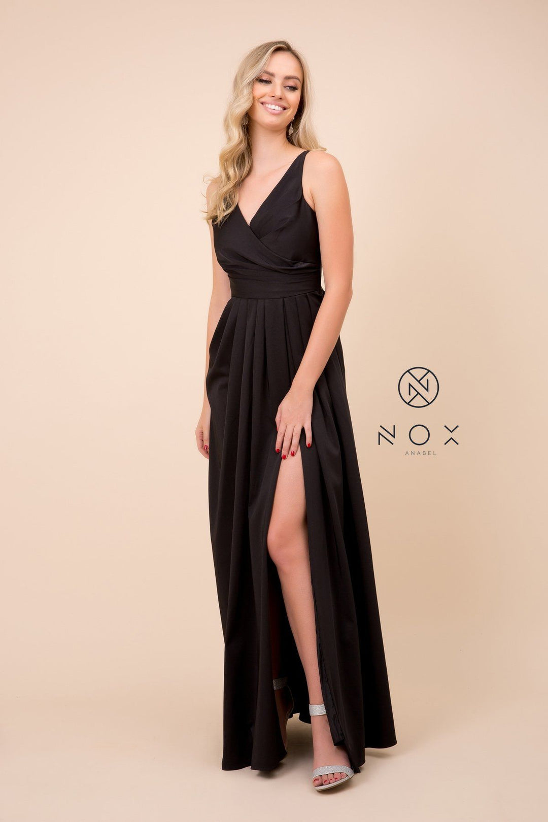 Simplicity at its best, dance the night away in this long sleeveless ruched V-neck dress by Nox Anabel 8347. This long evening gown features a sleeveless tank bodice with V-neckline, a front slit for a touch of sexiness, open back supported with double spaghetti straps, full length A-line skirt that elegantly flows to the floor, and a zipper closure.