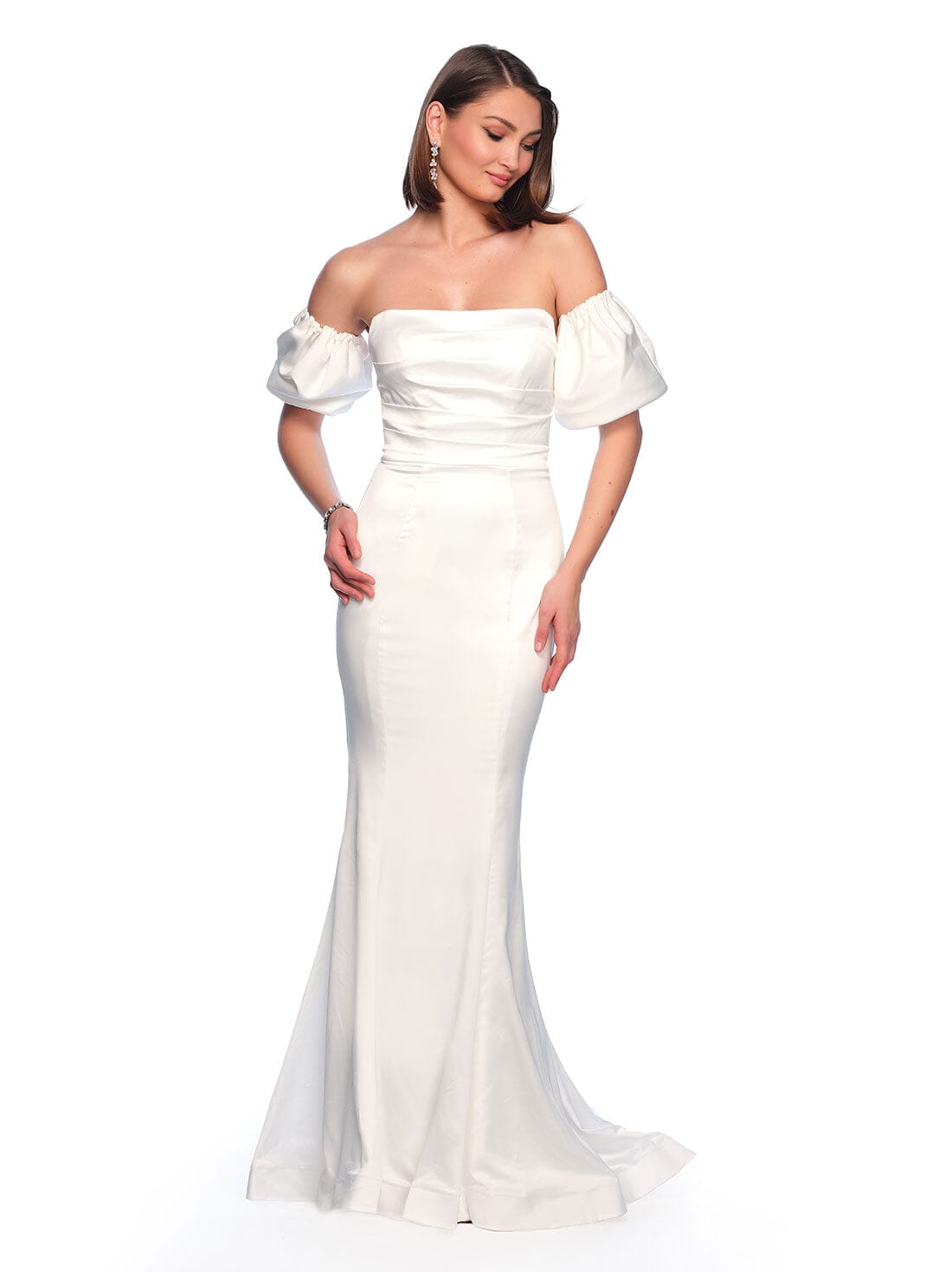 All eyes will be on you in this satin long strapless puff sleeve satin bridal dress with a fitted mermaid skirt by Dave & Johnny 11342. The detachable puff sleeves are included - giving you a versatile second look!