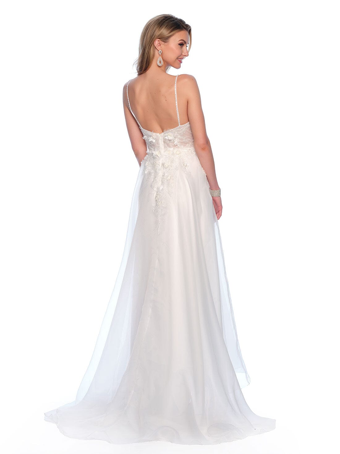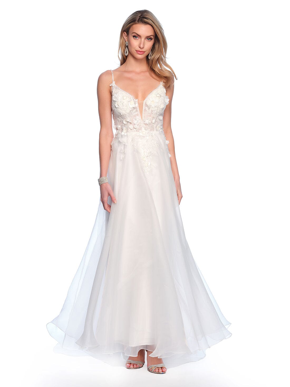 Be the center of attention in this 3D floral applique long sleeveless organza bridal dress with an A-line skirt by Dave & Johnny 11948.