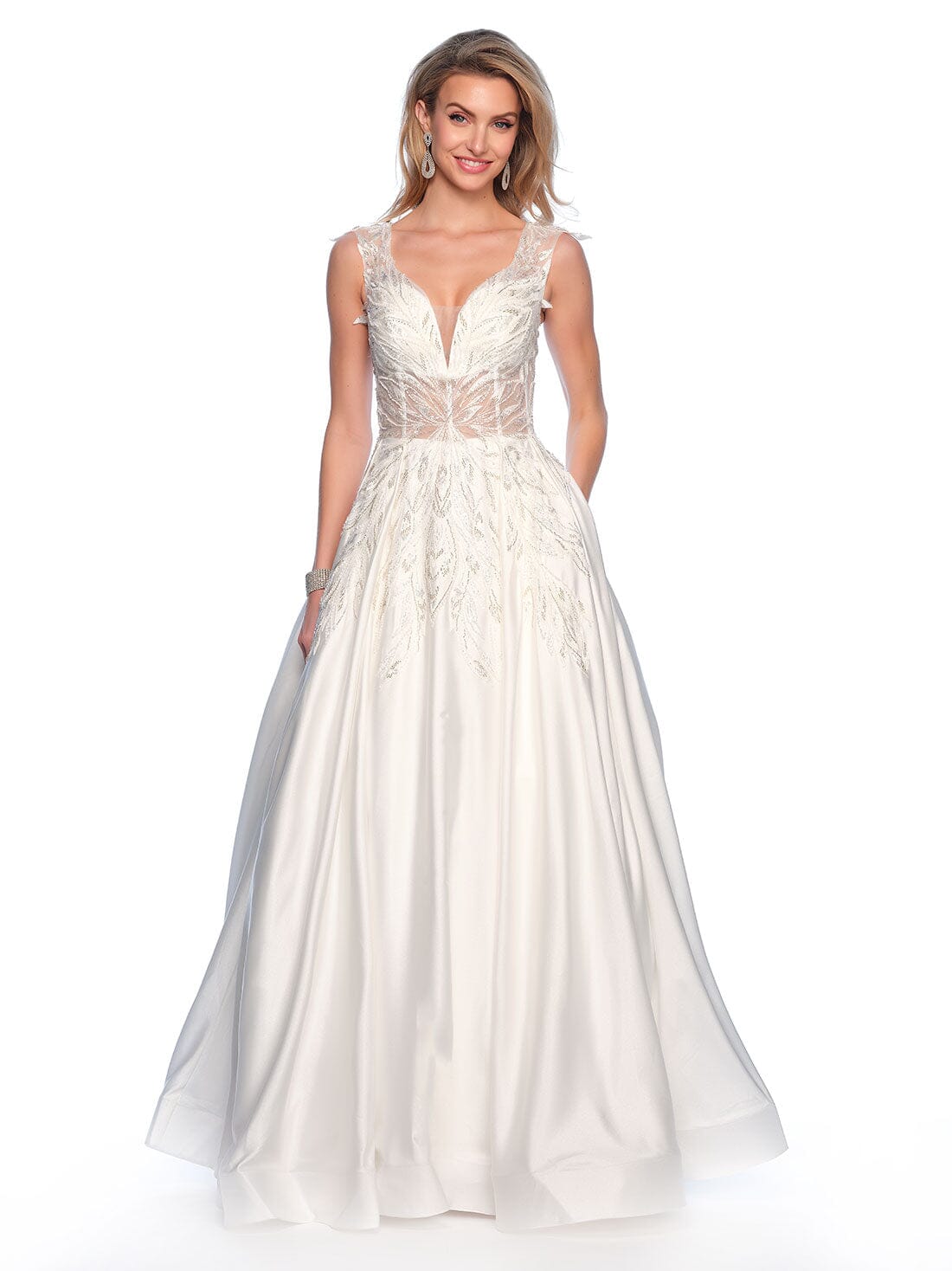 Show off your fashion sense in this sequin applique long sleeveless bridal dress with an A-line skirt by Dave & Johnny 12054.