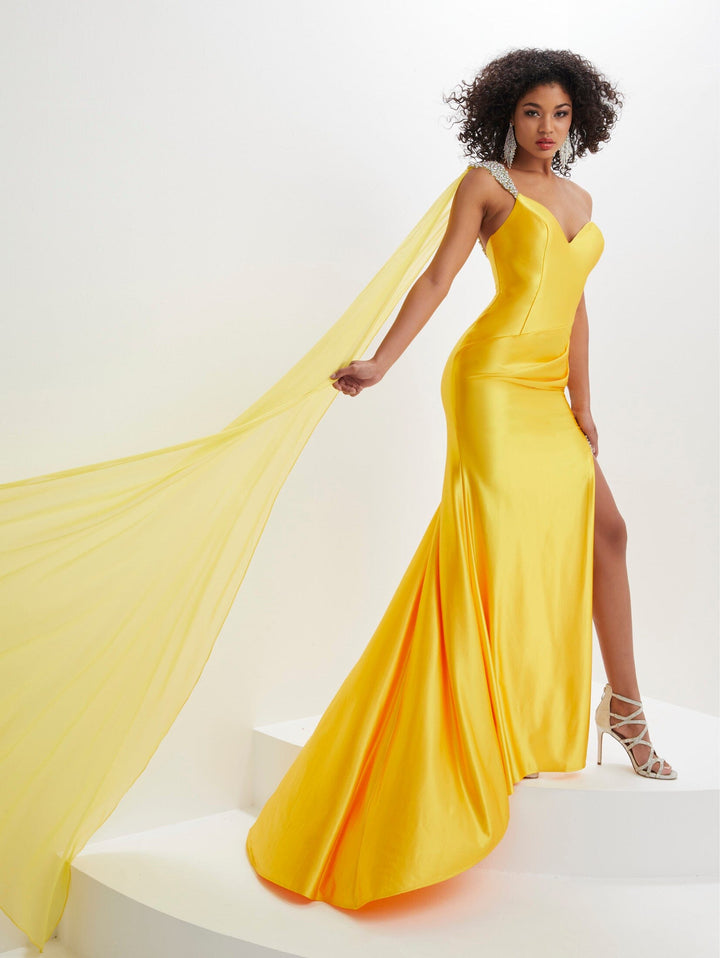 This stunning gown in spandex features a sweetheart neckline, one shoulder AB stone encrusted strap with chiffon float, a draped fitted body with a trumpet skirt and a high slit.