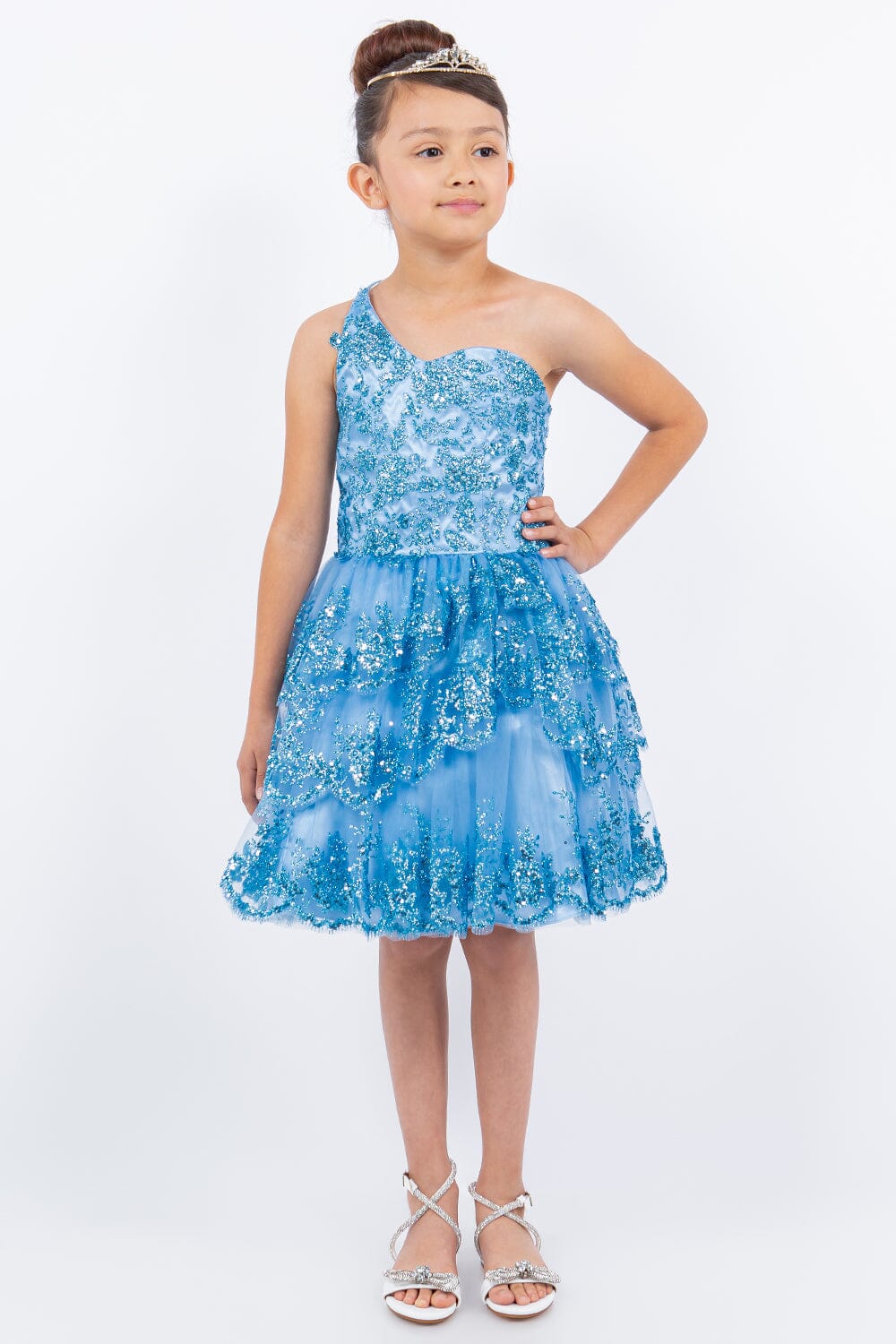- Girls Short One Shoulder Tiered Dress by Cinderella Couture 5132