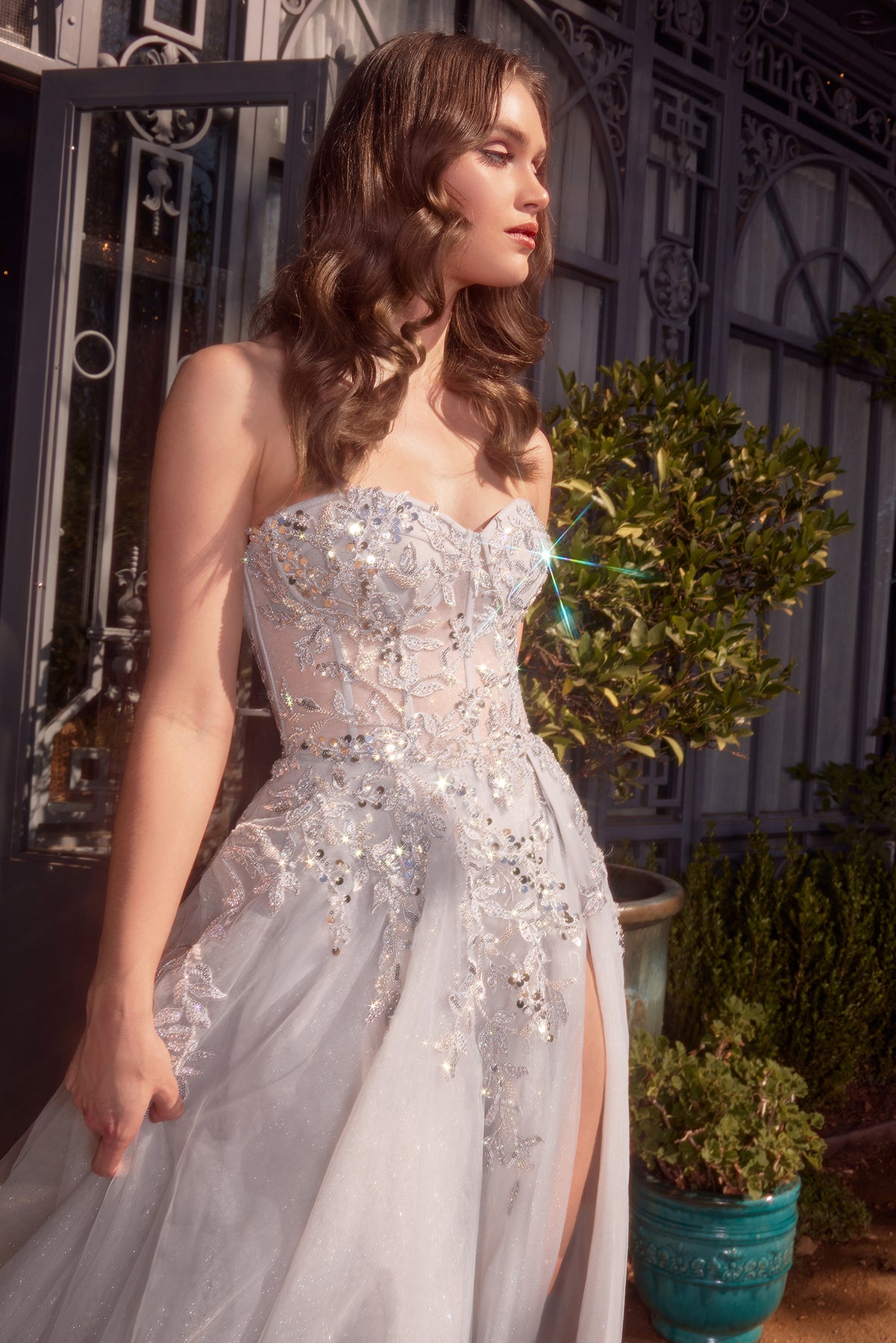 • Applique Strapless A-line Slit Gown by Andrea and Leo A1415