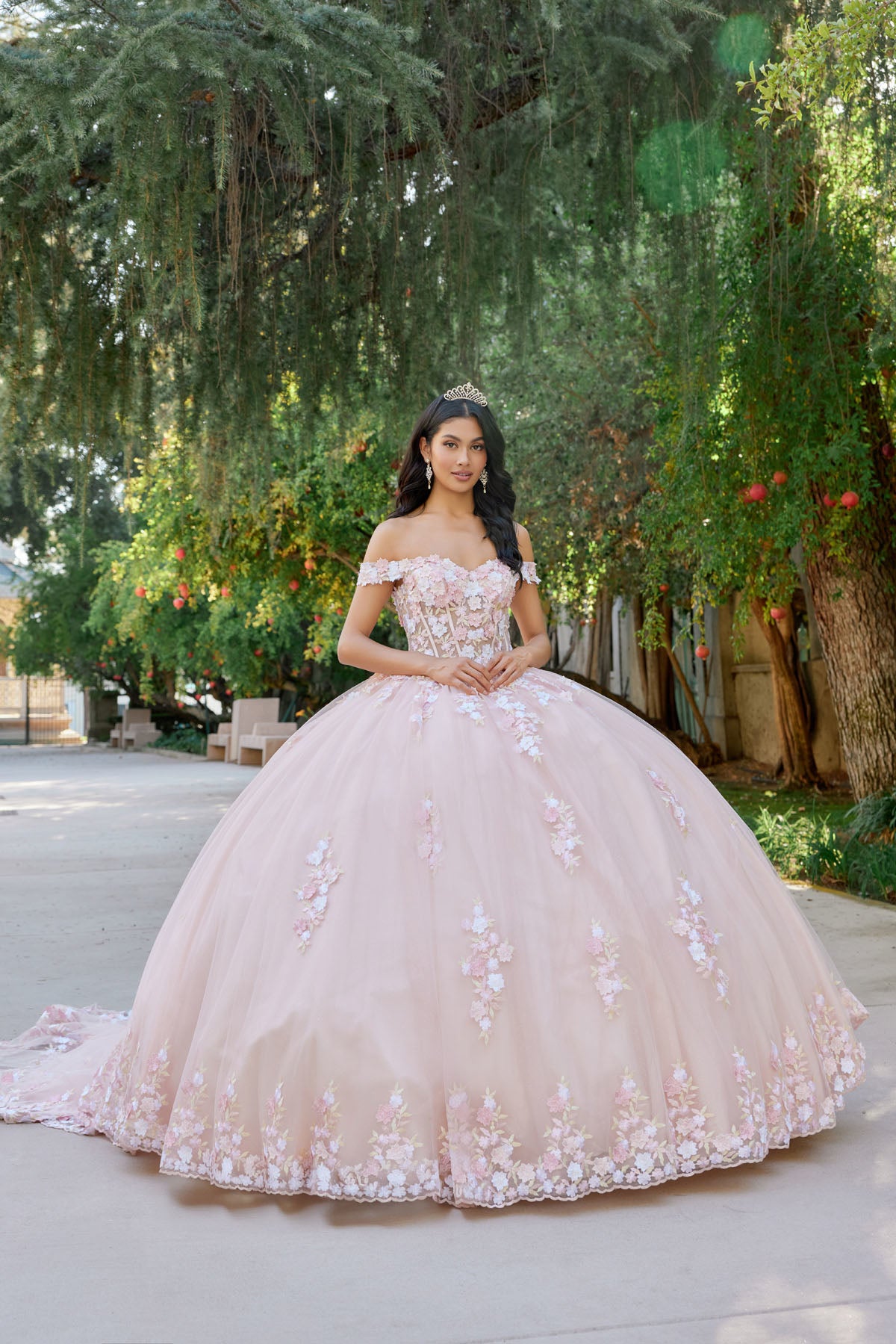 Dance the night away in this 3D floral applique long off the shoulder sheer corset dress with an A-line skirt by Juliet JT1460J. Off-the-shoulder quinceañera ball gown features a sweetheart neckline, straps with 3d lace appliqué, an illusion bodice with floral embroidery.