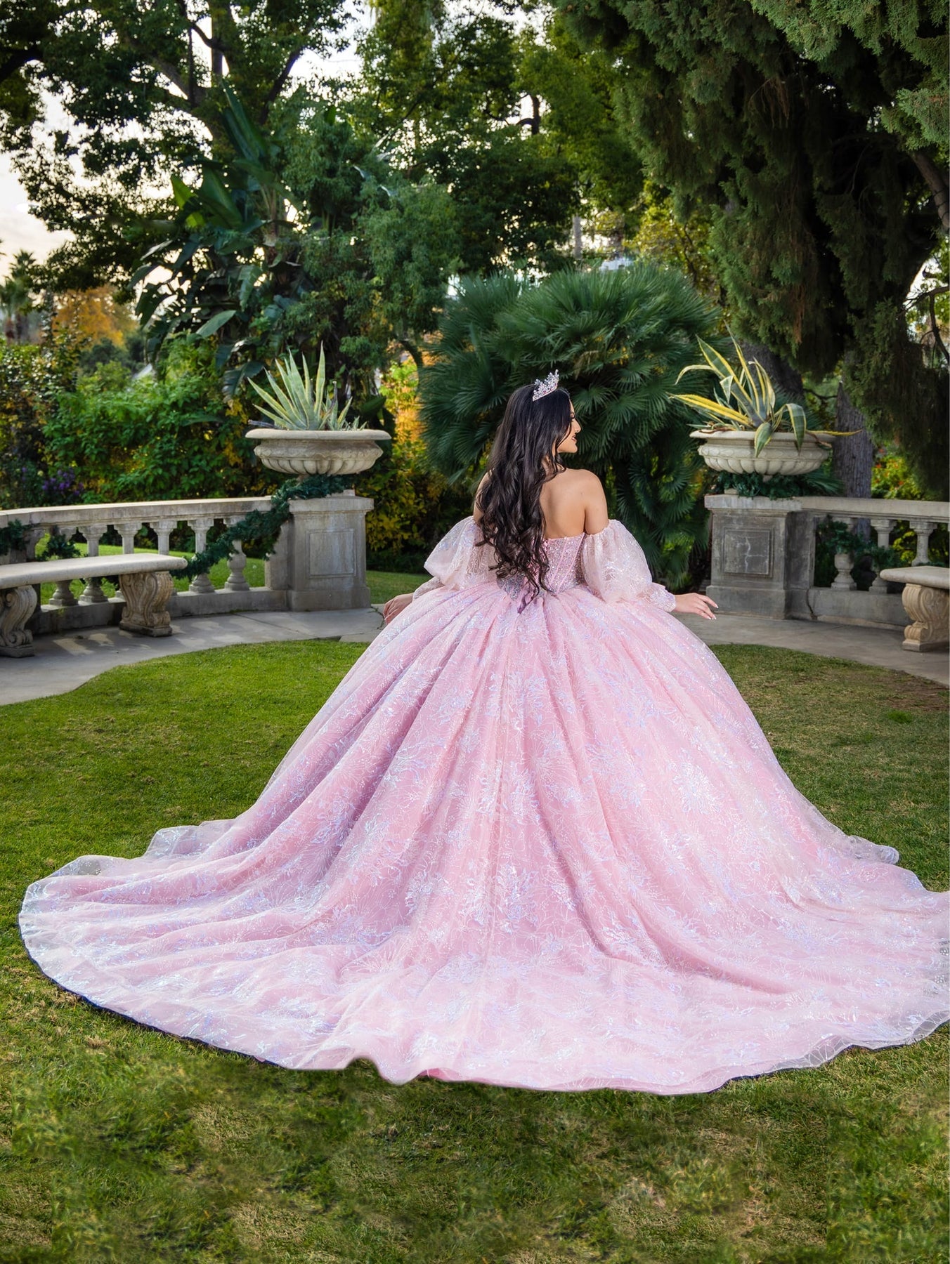 Light up the room in this beaded lace applique long strapless puff sleeve dress with an A-line skirt from LizLuo Quince by the House of Wu 26084. This modern quince ball gown features a rhinestone and crystal beading bodice that is actuated with a boning structure. The classic sweetheart neckline is perfect for any shape and size. Gorgeous buff sleeves are the perfect touch of excitement. The full ball gown skirt is this gorgeous glitter floral fabric that finishes this stunning style.