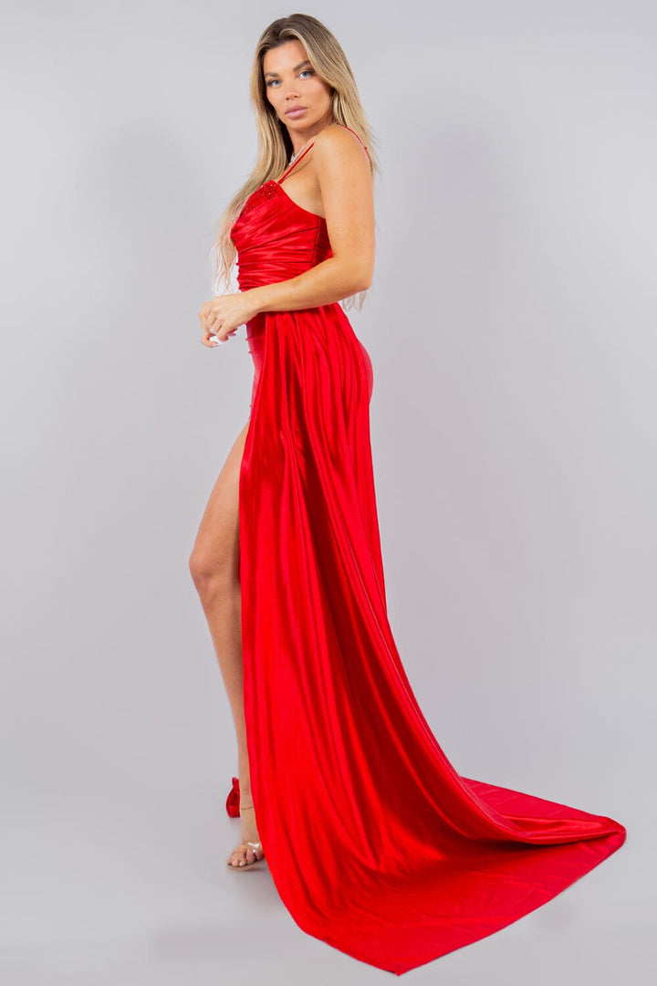 - Fitted Beaded Satin Slit Gown by Cinderella Couture 8082J