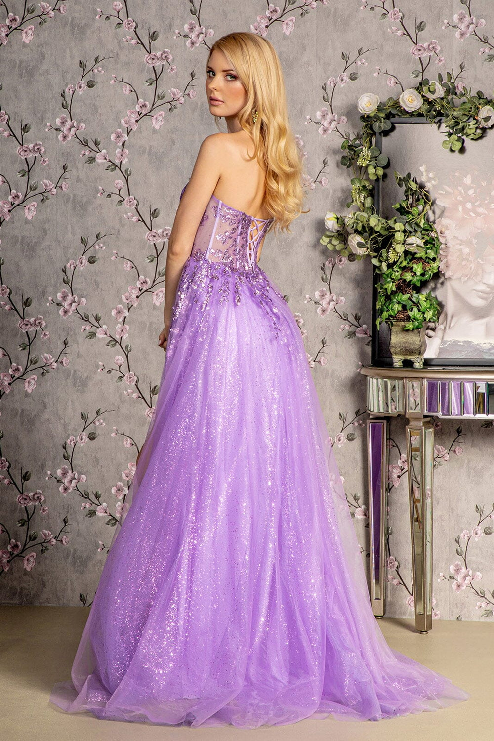 Sparkle and shine in this sequin applique long strapless sheer corset dress with A-line slit skirt by GLS Gloria GL3209.