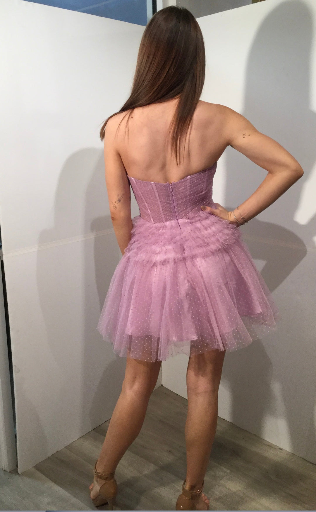 Be the center of attention in this tulle short strapless dress with an A-line ruffled skirt by Jovani 40467. This enchanting short dress features a strapless sweetheart neckline and a whimsical tulle fabric adorned with subtle polka dot details. The fitted bodice and ruffled tiers at the waist create an ethereal A-line silhouette, perfect for making a statement at any special event. The dress also features an open back style for an added touch of allure.