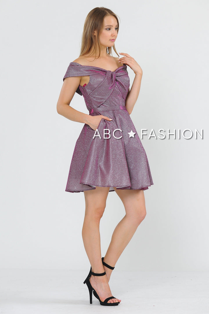 Look picture-perfect in this off shoulder metallic glitter cocktail dress with pockets by Poly USA 8356. This beautiful short off shoulder dress features a twist front neckline, side pockets, open back, short A-line skirt, and a zipper closure. Affordably priced at $129, this short party dress is perfect for any formal event and will keep you on budget!