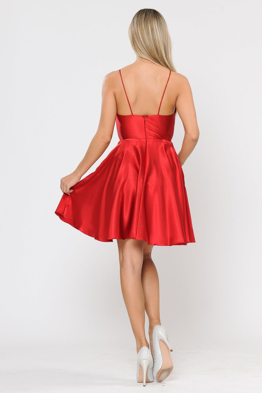 Be a trendsetter in this beautiful short V-neck wrap cocktail dress with shorts by Poly USA 8544. Affordably priced under $130, this short party dress is perfect for any formal event and will keep you on budget!
