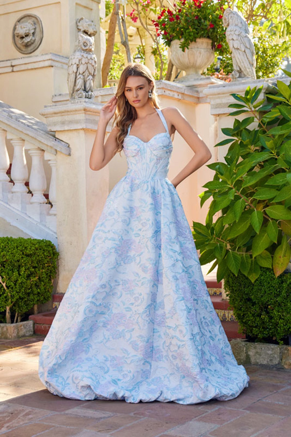 Elevate your evening attire in this long sleeveless jacquard print dress with an A-line skirt by Juliet JT2742A. Victorian floral jacquard ballgown with a sculpted corset bodice.