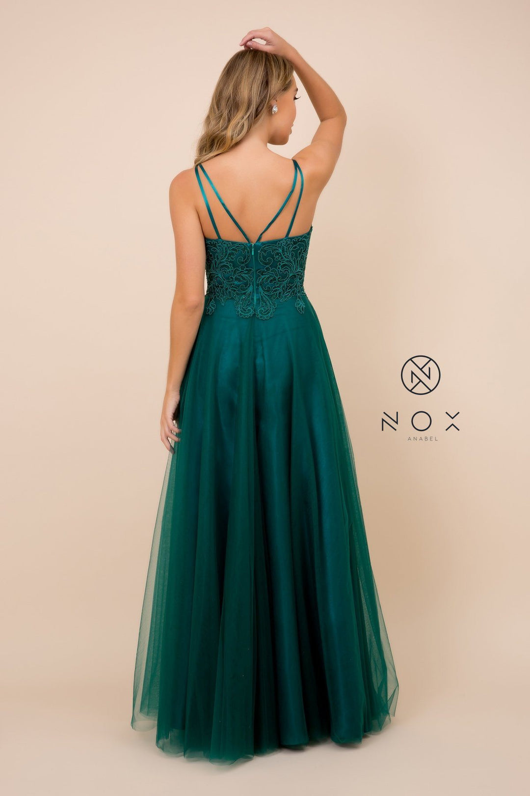 Be the center of attention in this long A-line embroidered dress with tulle skirt by Nox Anabel R357.