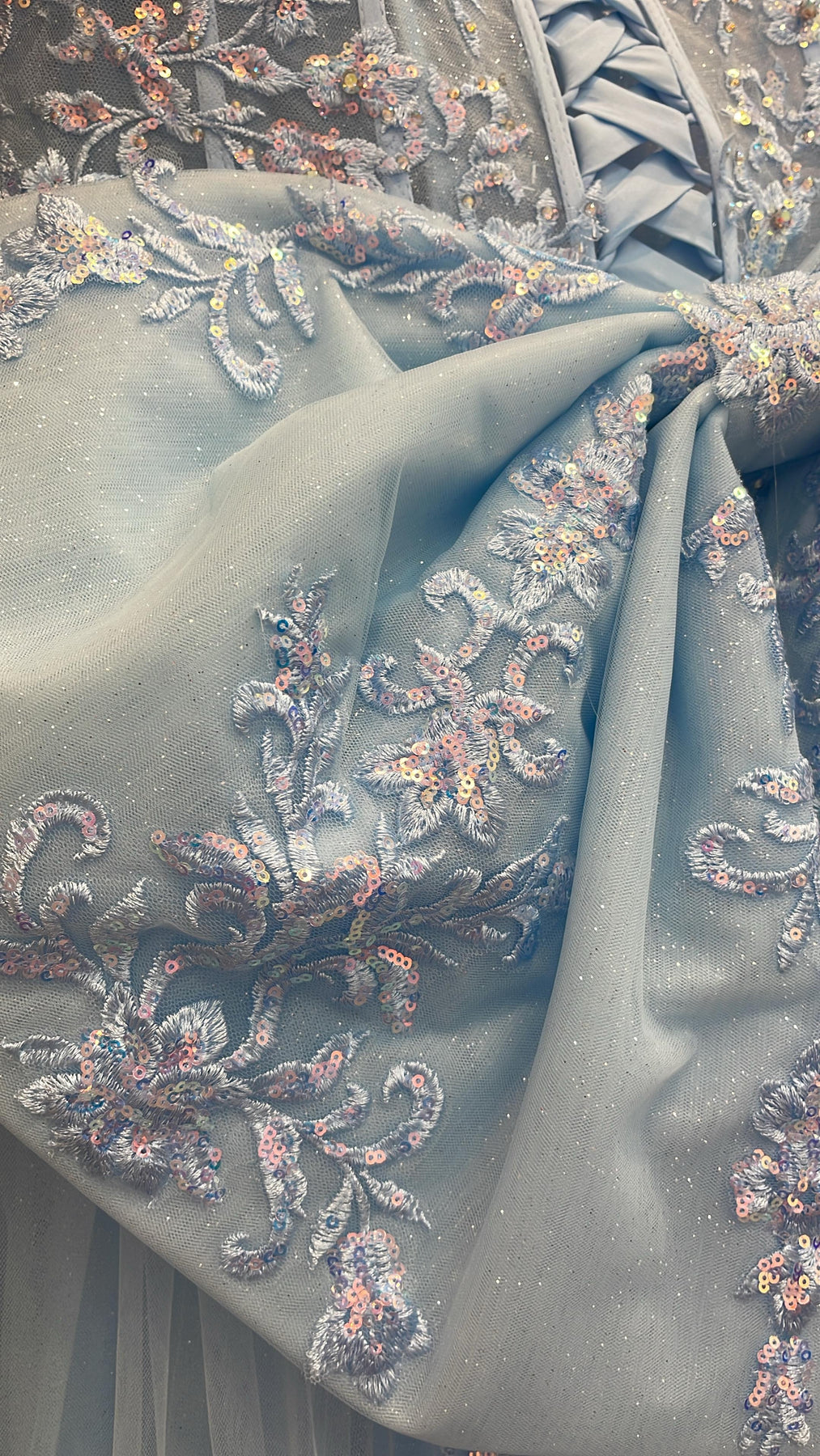 - Fabric: Glitter Tulle, Lace Appliques, Beaded Embellishments, Embroidery, Polyester