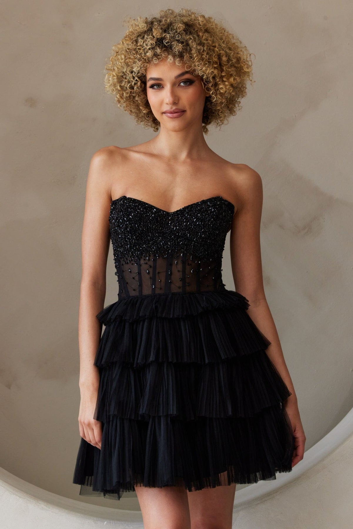 Be a trendsetter in this beaded short strapless sheer corset dress with an A-line layered tiered skirt by Amelia Couture BZ9999S.