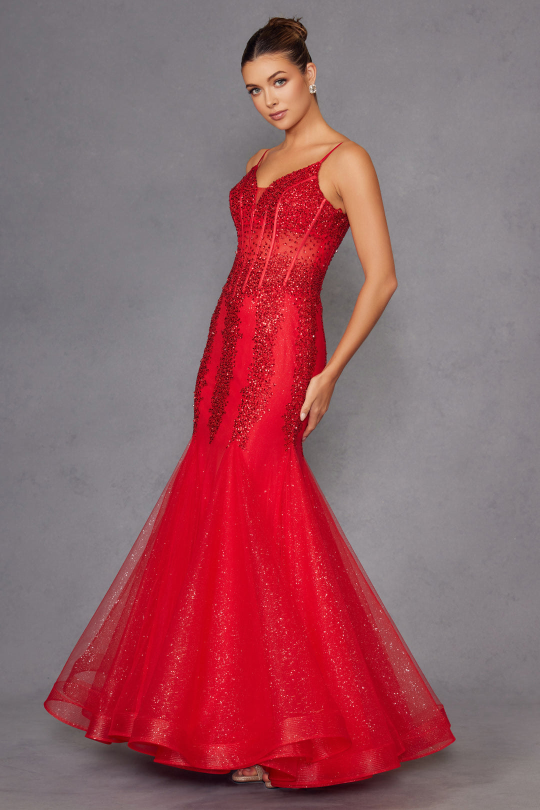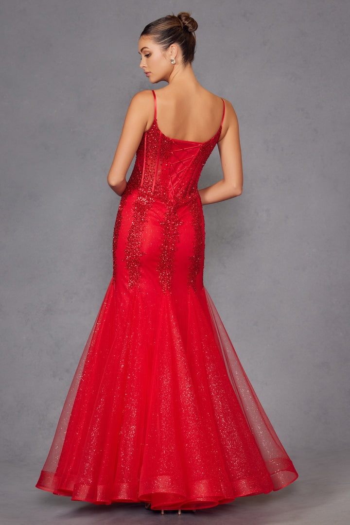 Make your special day sparkle in this sequin and glitter embellished long sleeveless V-neck dress with a fitted mermaid skirt by Juliet JT2883C. This exquisite mermaid style dress is designed to captivate and impress. It features a fitted corset adorned with intricate beading and sequins, creating a shimmering effect that catches the light beautifully. The dress has spaghetti straps and a sweetheart neckline, adding a touch of elegance and sophistication. The waist is cinched, accentuating the wearer’s figure, and leads into a flared mermaid skirt made of tulle. Perfect for formal events, this dress combines classic mermaid styling with modern detailing, making it an ideal choice for those looking for an elegant piece.