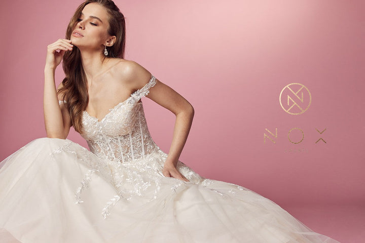 Look picture-perfect in this floral applique long corset style off the shoulder dress with A-line skirt by Nox Anabel JH925.
