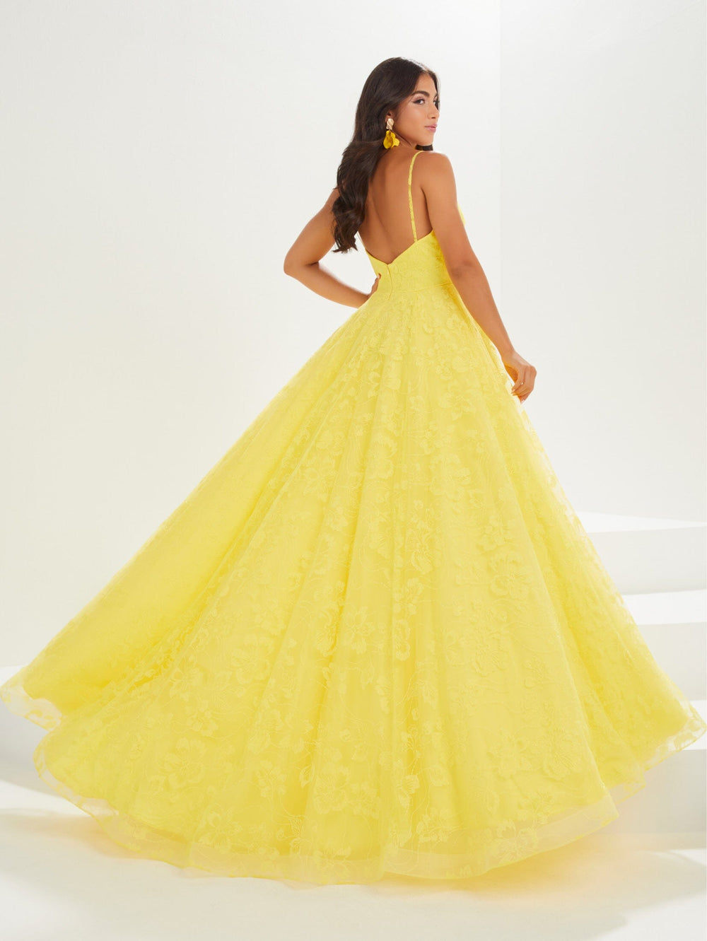Spaghetti strap, glitter tulle A-line dress with floral appliqués and a front side slit. Center zipper back and sweep train.