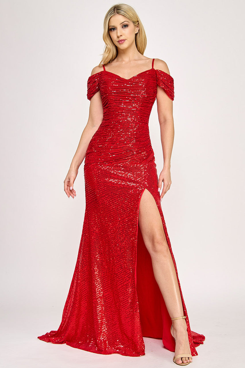 Sequin Fitted Off Shoulder Slit Gown by Lenovia 8218
