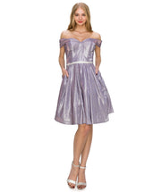 You'll love twirling around in this short off the shoulder metallic glitter dress with A-line skirt by Cinderella Couture 8012J. This cocktail dress features a sweetheart off shoulder bodice with draped short sleeves, bead embellished waistband, short A-line skirt, and a zipper back.