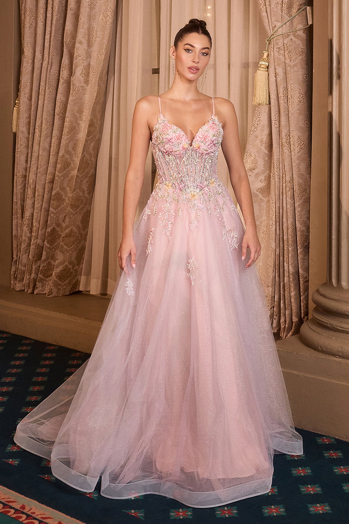 Be the center of attention in this floral applique long sleeveless dress with an A-line skirt by Andrea & Leo A1477. This enchanting ball gown features a deep V-neckline and a sheer, structured bodice adorned with delicate floral printed appliqué and shimmering beadwork. The layered glitter tulle skirt adds volume and sparkle, creating a dreamy, fairytale-inspired silhouette. With its flattering structure and romantic details, this gown is perfect for making a lasting impression at any formal celebration.