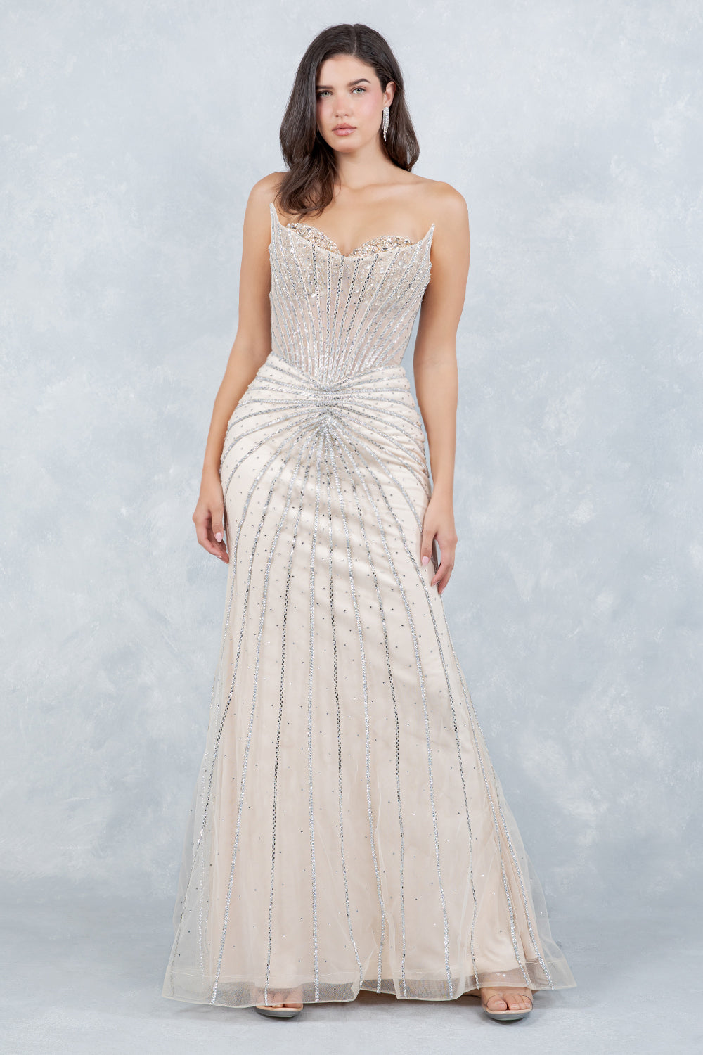 Sparkle and shine in this bead embellished long strapless dress with a fitted skirt by Cinderella Couture 8576J. This breathtaking gown is pure red-carpet radiance, sculpted to make a dramatic entrance from every angle. The strapless bodice dazzles with dense crystal embellishments, flowing into sleek, radiant lines that elongate the figure and create a stunning starburst effect at the waist. Sheer paneling adds a touch of allure while maintaining elegant sophistication. The fitted silhouette glides into a graceful mermaid-style skirt, sprinkled with shimmering stones that catch the light with every step. The lace-up back adds a couture touch and ensures a flawless fit. Bold, glamorous, and unforgettable—this gown transforms any moment into a spotlight moment.