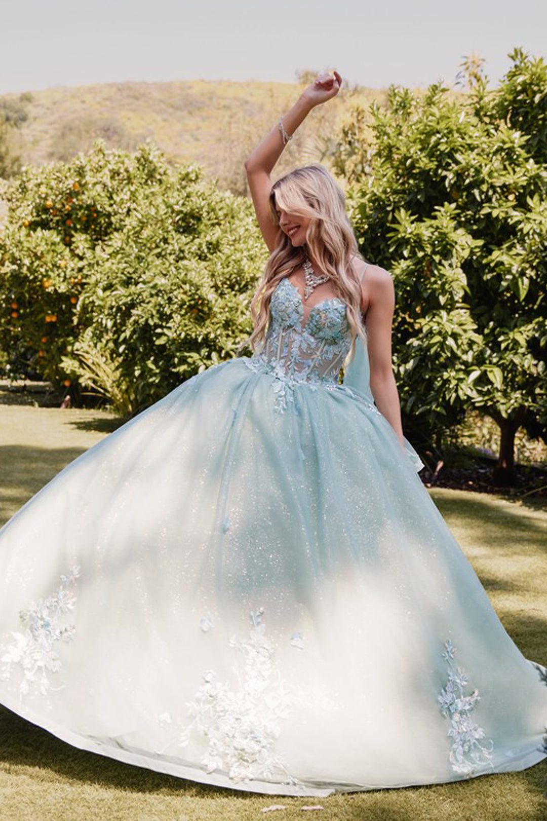 - Fabric: Glitter Tulle, Floral Appliques, Embroidery, Beaded Embellishments, Polyester
