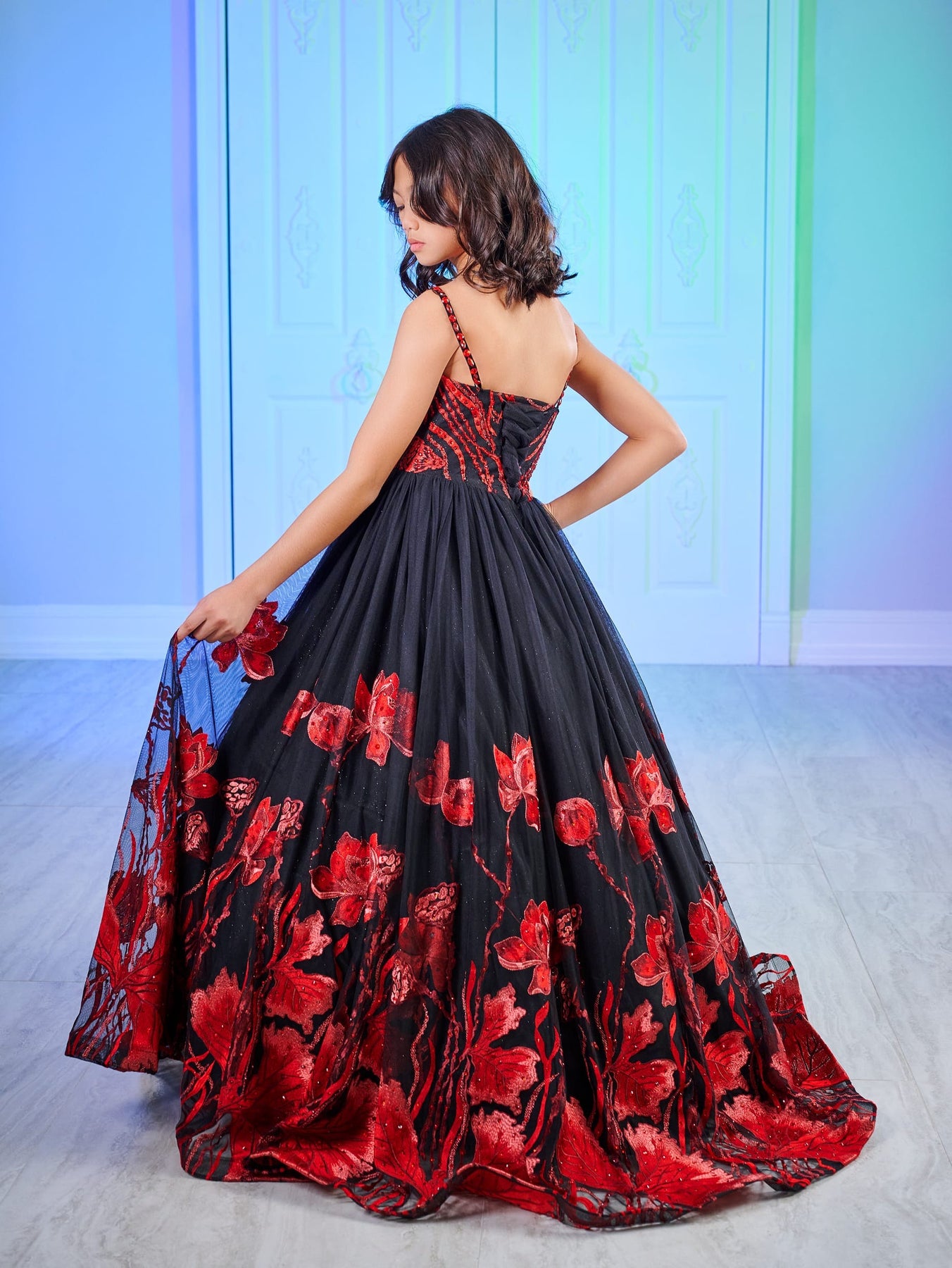Your sweet girl will dazzle the room in this long sleeveless floral print dress with an A-line skirt by Mini Quince 80014MQ. This beautiful gown features a sleeveless sweetheart bodice adorned with beaded embellishments, an open lace-up back, and a floor length A-line skirt that ends with a train.