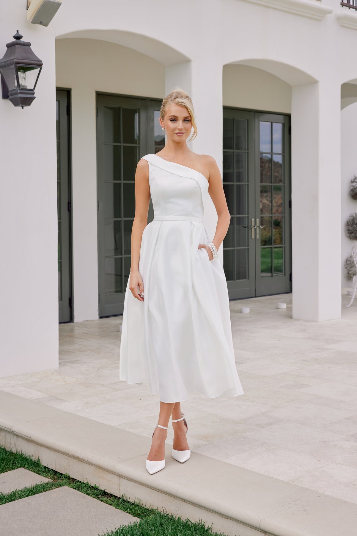 - White One Shoulder Tea Length Dress by Nox Anabel JE931W