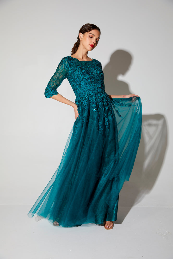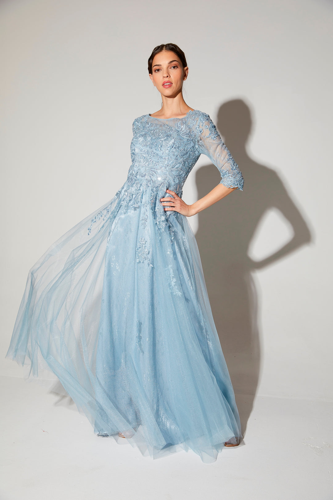 Make your special day sparkle in this lace applique long 3/4 sleeve tulle dress with an A-line skirt by Eureka 9660. Quarter sleeved, sweeping floor length gown, overlay with mesh sequin with lace, and zipper back.